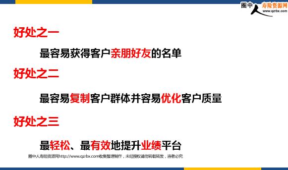 健康险销售逻辑训练06 —索取转介绍 任何一套专业化行销流程都说:递交保单时是要求转介绍大好时机! 但实际情况是—— 我们似乎很难开口! 三个好处三个步骤两个后续动作两种切入逻辑 递送保单法 好处之一 最容易获得客户亲朋好友的名单 好处之二 最容易复制客户群体并容易优化客户质量 好处之三 最轻松、最有效地提升业绩平台 递送保单转介绍三个步骤 步步跟进,环环紧扣 第1步:以提供服务,要求转介绍第2步:以树立品牌,要求转介绍第3步:以服务质量,要求转介绍第1步:以提供服务,要求转介绍 “作为我们公司的客户,我们必须要为您提供最优质服务。您现在可以挑出5个最要好的朋友,我们可以免费给他们提供一些资料供他们参考,他们买不买都无所谓的。您就把他们的名字和电话写在回执的反面,为了方便邮寄,也请您把地址一并写在后面,便于我们统一进行汇总和安排时间。” 在递送保单后必说的一句话: 第2步:以树立品牌,要求转介绍 客户会说:“我还是先问一下我的朋友,如果他需要我再告诉您。” 这样的拒绝和怀疑是很正常的,跟客户说: “第一,您不用很紧张,您担心朋友会怪您,这个我能理解,但是我们的服务确实是一流的。您认为,我给您服务,您放心吗?那如果我来为您的朋友服务,您放不放心?第二,您朋友买不买保险真的不重要,只不过您是我们的客户,我们必须要为您提供服务,让他多了解些最新的信息。再说了,公司的品牌也要靠客户口碑相传。比如说既然您买了我们公司的产品,第一,您肯定是信任我们公司的,第二,您肯定是信任我的。所以,我们希望您能把这份信任传播出去。不管怎样,您今天在这里写上5个朋友的名字跟电话,具体他们买不买都不重要。客户间的口碑传播对保险公司来说是最好的广告。如果我们现在所有客户都能够帮我们做口碑传播的话,那我们公司未来的发展会更好、更稳。这也是您所期望的对吗?” 如果客户还是犹豫不决,一定要强调“品质考核”。要说: “您已经是我们公司的客户了,如果我们连公司免费的服务都不能提供的话,那我们公司就会认为我对您的服务没有做到位。如果我今天把您这份保单回执交回公司,而上面没有一个客户的名单,那我们公司一定会考核我的服务质量的。今天还请您为我提供几个最要好的朋友,让我来为他服务。”