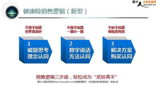 保险让生活更美好 健康险销售新思维 contents 背景分析 销售逻辑 工具说明 辅销用品 背景分析 关键要想明白4件事(核心问题): 1、为什么客户要买(健康)保险?而不是买银行或P2P或基金解决产品导向性问题 2、为什么要买**保险公司的保险产品而不是行业内其它保险公司产品 解决公司导向性问题 3、为什么客户要买你的产品? 而不是在其它代理人手上买 解决个人品牌问题 4、为什么要现在买 而不是过一段时间再买 解决客户不急的问题 Q1:为什么客户要买健康险? 传统销售思维 新型销售思维 1、现在环境太差:空气污染、水污染、食品安全、生活习惯、工作压力……(简直生活在地狱里) 2、各种大病高发:列举一堆名人患重疾离世案例来证明……(简直感觉要活不到明天) 3、现在看病太贵:列举一大堆数据证明治病太贵、手术太贵……(治不起病简直要绝望) 4、结论:地球太危险、赶快买保险 能不能不要这么痛苦和可怕?保险让生活更美好!能否让客户看到美好和希望? Q2:为什么客户要买**保险公司的产品? Q3:为什么客户要买你的产品? 澄清两个观念:客户买保险,不是因为保险有多好,而是因为保险能解决TA的问题!客户是因为认同你的观念、进而认同你这个人、最终选择购买你的产品!即使你的产品不如同业公司。结论:客户为什么买?因为你成功的激发了TA的需求,并刚好有解决方案去满足了这个需求!