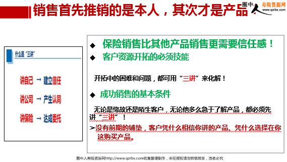 借政策之势,借公司之力 7步练就客户不能拒绝的销售逻辑 从文件中寻找趋势! 《中国保监会关于规范人身保险公司产品开发设计行为的通知》 一、保险公司开发设计保险产品时应当遵循并坚持以下原则: (一)以消费者的需求为中心,发展有利于保障和改进民生的人身保险产品; (二)以我国国情和行业发展为实际考量,发展符合自身规律,符合国家发展战略导向的人身保险 产品; (三)以保险基本原理为根本,借鉴国际经验,发展保障功能突出,符合损失分担、风险同质和大数法则的人身保险产品。 解读1:坚持行业根本价值理念,“保险姓保” 保险风险管理的本质 突出定期寿险、终身寿险等财富管理和保障功能突出年金险的养老现金流规划 风险管理是家家户户都需要的,这也是支持我国保险业持续快速发展的根本。 保险产品的设计要以消费者需求为中心,关注客户的风险保障需求,而不是以产品为中心。 衍生到销售端,也应当以客户需求为核心,基于每 个个体不同的家庭结构和财务状况,评估存在的风险点和风险损失额度的大小,确定险种和保额保费预算后,才匹配产品。这样的销售模式,大大有利于客户。 解读2:保险产品设计应当以消费者的需求为中心 建立健康险销售逻辑图 销售首先推销的是本人,其次才是产品! 保险销售比其他产品销售更需要信任感! 客户资源开拓的必须技能 开拓中的困难和问题,都可用“三讲”来化解! 成功销售的基本条件