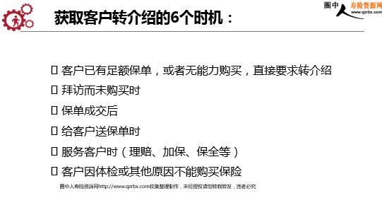 打通保险销售事业命脉转介绍 客户是保险销售人员的命脉,因此如何不断地开发名单,取得名单,从而拥有稳定来源的客户名单,是保险销售人员业绩稳定的基石,也成为保险销售人员日常经营的重要功课。 一些公司在准新人加入之前,会要求其把认识的亲戚、朋友、老同事等写在准客户名单册上,其目的是帮助新人做现有人脉关系的评估,并帮助新人在市场开拓前做好准备。 这其实是一种非常严谨负责任的做法。从缘故市场开始业务拓展最大的好处是,在专业度和技能不够熟练的前提下,新人一方面比较了解这些准客户的需求,另一方面容易获得他们的信任。 保险销售人员不可能在熟人圈子里永远转下去。因此,新人必须在缘故市场生根发芽后, 学会从中开拓新客户的方法,才能走向良性发展的轨道。 保险销售人员离职的最大原因,并不是不会卖保险,而是没有人可以拜访。因此保险销售人员一定要加强对于转介绍的认知,毕竟相较陌生市场,转介绍无疑是最为有效也最省力的准客户开拓方式。 客户名单来源优劣分析 获得客户转介绍两个前提 获取客户转介绍的6个时机: 一次和客户接触的机会,都是要求转介绍名单的时机; 一、初次约访需求分析时 所以需求分析访谈内容越详细,客户名单也会积累得越多。 一、初次约访需求分析时 这些名单,须先征得客户同意; 二、递送计划书或保单时 定的寿险顾问必须填写的表格,不知您是否愿意为我推荐一些名单,对于这些名单 ,我们会谨守保密的责任,而且日后与他们联系之前,我一定会先征得您的同意; 推荐给我们,要注意对推荐人应有的尊重。
