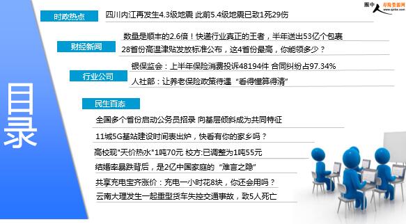 每日新闻速递 2019年9月9日 星期一 目录 时政热点 财经新闻 行业公司 民生百态 四川内江再发生4.3级地震 此前5.4级地震已致1死29伤 数量是顺丰的2.6倍!快递行业真正的王者,半年送出53亿个包裹 28省份高温津贴发放标准公布,这4省份最高,你能领多少? 银保监会:上半年保险消费投诉48194件 合同纠纷占97.34% 人社部:让养老保险政策待遇“看得懂算得清” 全国多个省份启动公务员招录 向基层倾斜成为共同特征 11城5G基站建设时间表出炉,快看有你的家乡吗? 高校现"天价热水"1吨70元 校方:已调整为1吨55元 结婚率暴跌背后,是2亿中国家庭的“难言之隐” 共享充电宝齐涨价:充电一小时花8块,你还会用吗? 云南大理发生一起重型货车失控交通事故,致5人死亡 时政热点 四川内江再发生4.3级地震 此前5.4级地震已致1死29伤 2019-09-08 09:01 来源:人民日报 中国地震台网正式测定:09月08日10时36分在四川内江市威远县(北纬29.51度,东经104.53度)发生4.3级地震,震源深度7千米。2019年9月8日06时42分,四川内江市威远县(北纬29.55度、东经104.79度)发生5.4级地震,震源深度10千米。据内江市应急管理局通报:截止9月8日上午10:00统计,地震已致1人死亡、29人受伤(其中,重伤2人),房屋倒塌17间、轻微受损215间。 财经新闻 数量是顺丰的2.6倍!快递行业真正的王者,半年送出53亿个包裹 2019-09-08 09:22 来源:全媒体聚焦 近年来,网上购物的普及速度越来越快,依附而生的快递行业的营收也是水涨船高。据国家邮政局数据显示,2019年上半年国内快递行业的业务总量收入高达7158.5亿元,相比往年增长29.5%。由此,足见快递行业极其迅捷的发展速度。而值得一提的是,在国内各大快递巨头的业务量方面,中通快递以53.7亿件的成绩稳居第一。半年送出53亿个包裹,这对于中通来说也算是第一次。而如此大的数量,足足是顺丰快递的2.6倍!所以从送快递的数量来看,中通也算是快递行业真正的“王者”了。