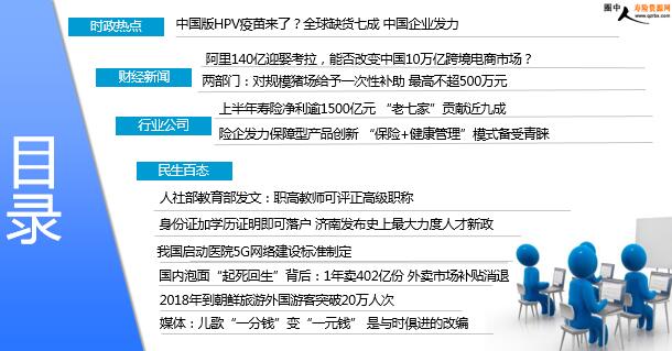 每日新闻速递 2019年9月10日 星期二 目录 时政热点 财经新闻 行业公司 民生百态 中国版HPV疫苗来了?全球缺货七成 中国企业发力 阿里140亿迎娶考拉,能否改变中国10万亿跨境电商市场? 两部门:对规模猪场给予一次性补助 最高不超500万元 上半年寿险净利逾1500亿元 “老七家”贡献近九成 险企发力保障型产品创新 “保险+健康管理”模式备受青睐 人社部教育部发文:职高教师可评正高级职称 身份证加学历证明即可落户 济南发布史上最大力度人才新政 我国启动医院5G网络建设标准制定 国内泡面“起死回生”背后:1年卖402亿份 外卖市场补贴消退 2018年到朝鲜旅游外国游客突破20万人次 媒体:儿歌“一分钱”变“一元钱” 是与时俱进的改编 时政热点 中国版HPV疫苗来了?全球缺货七成 中国企业发力 2019-09-09 01:01 来源:第一财经 被称为“可以预防癌症”的宫颈癌疫苗(HPV疫苗),其一出生便被全球追捧。其中,九价HPV疫苗一度供不应求。最新信息显示,中国学者和企业在研发新版疫苗上正在加紧发力。日前,中国在HPV疫苗领域上出现两则重磅信息。9月6日,中国生物所属研究院和成都公司联合研制的国家一类新药“11价重组人乳头瘤病毒(HPV)疫苗”Ⅰ期临床试验启动。同日,养生堂集团旗下的厦门万泰(Innovax)与全球疫苗巨头葛兰素史克(GSK)签署了一项合作协议,宣布双方将基于厦门万泰的创新抗原技你术与GSK的佐剂系统联合研发新一代的人乳头瘤病毒(HPV)疫苗,也就是大家所熟知的宫颈癌疫苗。 财经新闻 阿里140亿迎娶考拉,能否改变中国10万亿跨境电商市场? 2019-09-09 09:22 来源:中国新闻周刊 阿里20亿美元(约140亿元人民币)收购网易考拉的消息,在沸沸扬扬地传了半个多月以后,终于有了实锤。阿里巴巴表示,收购后,天猫进出口事业群总经理刘鹏将兼任考拉CEO,考拉品牌将继续保持独立运营。目前,网易考拉PC端界面已经更名“考拉海购”。有业内分析称,阿里巴巴此次收购,更多的考虑是为了防止拼多多对考拉的收购,所以给了远高于拼多多的报价。此外,阿里巴巴还作为领投方,参与了网易云音乐此轮7亿美元的融资。“把两起投资合起来看,无论是跨境电商还是音乐业务,都是阿里巴巴针对腾讯的防御战”,基岩资本副总裁岑赛铟对中国新闻周刊表示。