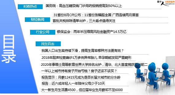 每日新闻速递 2019年9月13日 星期五 目录 时政热点 财经新闻 行业公司 民生百态 国务院:高血压糖尿病门诊用药报销提高到50%以上 31省份8月CPI公布:11省份涨幅超全国 广西连续两月居首 首批关税排除清单出炉,三大看点值得关注 银保监会:两年半压缩高风险金融资产14.5万亿 我国人口出生率持续下滑,提高生育率哪种方法更有效? 2018年超声检查确诊1万多例异常胎儿 早孕期能发现严重畸形 2020年泰晤士高等教育世界大学排名出炉,清华、北大首度揽获亚洲前二 一半以上城市持有房子开始亏钱?房子还该不该买? 报告显示:月薪12415元成为是否长留大城市的分水岭 报告:近六成年轻人一年陪伴父母少于10天 大一新生月生活费4500,但应届毕业生月薪却不足6000 时政热点 国务院:高血压糖尿病门诊用药报销提高到50%以上 2019-09-12 09:37:12 来源:中国政府网 国务院总理李克强9月11日主持召开国务院常务会议,要求紧扣群众关切进一步保障好基本民生;决定出台城乡居民医保高血压糖尿病门诊用药报销政策,减轻数亿患者负担;部署深入推进医养结合发展,更好满足老年人健康和养老需求。为进一步加强重大慢性病防治,减轻患者用药负担,会议决定,对参加城乡居民基本医保的3亿多高血压、糖尿病患者,将其在国家基本医保用药目录范围内的门诊用药统一纳入医保支付,报销比例提高至50%以上。有条件的地方可不设起付线,封顶线由各地自行设定。对已纳入门诊慢特病保障范围的患者,继续执行现有政策,确保待遇水平不降低。推动国产降压、降糖药降价提质。加快推进集中招标采购,扩大采购范围,降低购药成本,推行长处方制度,多措并举减轻患者负担。这也有利于强化预防、减少大病发病率,有利于医保基金可持续。 财经新闻 31省份8月CPI公布:11省份涨幅超全国 广西连续两月居首 2019年09月12日11:47 来源:中新经纬 8月份全国CPI同比上涨2.8%,涨幅连续六个月处于“2时代”,从环比看,全国居民消费价格环比上涨0.7%。中新经纬客户端梳理发现,分省份来看,11个省份8月份CPI同比涨幅超过全国平均水平。3地8月份CPI同比涨幅与全国持平。17省份CPI同比涨幅低于全国。其中,广西涨幅5.2%,居第一,连续两个月涨幅最高。国家统计局指出,8月份,猪肉供应偏紧,价格上涨23.1%,涨幅比上月扩大15.3个百分点,影响CPI上涨约0.62个百分点。受中秋节临近和消费替代影响,鸡蛋、牛肉、羊肉、鸡肉和鸭肉价格上涨2.0%-5.9%,合计影响CPI上涨约0.10个百分点。受台风及高温天气影响,鲜菜价格上涨2.8%,影响CPI上涨约0.07个百分点。