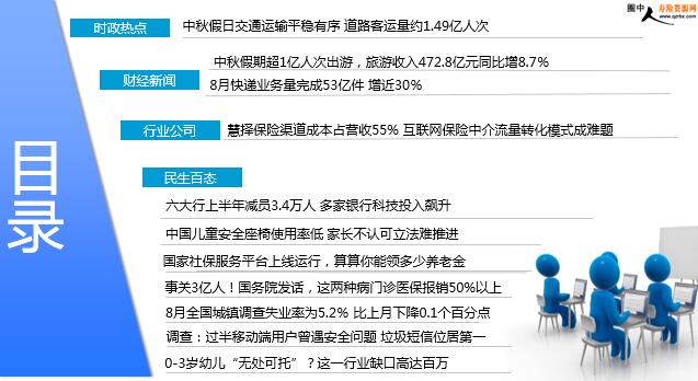 每日新闻速递 2019年9月17日 星期二 目录 时政热点 财经新闻 行业公司 民生百态 中秋假日交通运输平稳有序 道路客运量约1.49亿人次 中秋假期超1亿人次出游,旅游收入472.8亿元同比增8.7% 8月快递业务量完成53亿件 增近30% 慧择保险渠道成本占营收55% 互联网保险中介流量转化模式成难题 六大行上半年减员3.4万人 多家银行科技投入飙升 中国儿童安全座椅使用率低 家长不认可立法难推进 国家社保服务平台上线运行,算算你能领多少养老金 事关3亿人!国务院发话,这两种病门诊医保报销50%以上 8月全国城镇调查失业率为5.2% 比上月下降0.1个百分点 调查:过半移动端用户曾遇安全问题 垃圾短信位居第一 0-3岁幼儿“无处可托”?这一行业缺口高达百万 时政热点 中秋假日交通运输平稳有序 道路客运量约1.49亿人次 2019-09-16 10:10 来源:中国新闻网 据交通运输部官方微信消息,2019年中秋节假期,交通运输平稳有序,预计完成道路客运量约1.49亿人次。全国公路网交通流量总体略高于日常水平,交通流量分布呈现“首尾高中间缓”特征,公路出行以中短途自驾为主,交通流量总体低于劳动节及端午节假期。道路旅客以中短途出行为主,探亲、旅游出行需求旺盛,全国累计投入班线客车、旅游包车约65万辆。各地交通运输主管部门组织运输企业加强客流规律研判分析,强化组织调度,重点加强客运枢纽、旅游景区景点等客流密集地区运力供给,动态调整发班频次,做好民航、铁路干线运输与道路客运、城市公共交通、出租汽车的衔接转运,及时疏运到发旅客。 财经新闻 中秋假期超1亿人次出游,旅游收入472.8亿元同比增8.7% 2019年09月16日11:47 来源:中新经纬 全国接待国内旅游总人数1.05亿人次,同比增长7.6%;实现国内旅游收入472.8亿元,同比增长8.7%。数据显示,相比五一、端午等小长假,中秋出游中,两代、三代同游的人次占比提升约14%。据文旅部网站15日消息,2019年中秋节期间,各地文化和旅游产品供给充足,民俗活动丰富多彩,假期市场安全平稳有序。经文化和旅游部综合测算,全国接待国内旅游总人数1.05亿人次,同比增长7.6%;实现国内旅游收入472.8亿元,同比增长8.7%。