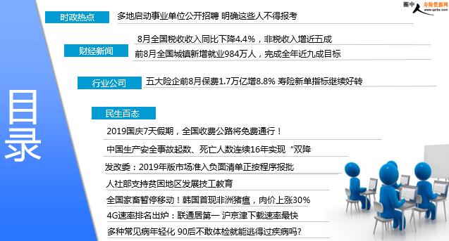 每日新闻速递 2019年9月19日 星期四 目录 时政热点 财经新闻 行业公司 民生百态 多地启动事业单位公开招聘 明确这些人不得报考 8月全国税收收入同比下降4.4%,非税收入增近五成 前8月全国城镇新增就业984万人,完成全年近九成目标 五大险企前8月保费1.7万亿增8.8% 寿险新单指标继续好转 2019国庆7天假期,全国收费公路将免费通行! 中国生产安全事故起数、死亡人数连续16年实现“双降 发改委:2019年版市场准入负面清单正按程序报批 人社部支持贫困地区发展技工教育 全国家畜暂停移动!韩国首现非洲猪瘟,肉价上涨30% 4G速率排名出炉:联通居第一 沪京津下载速率最快 多种常见病年轻化 90后不敢体检就能逃得过疾病吗? 时政热点 多地启动事业单位公开招聘 明确这些人不得报考 2019-09-18 11:44 来源:中国新闻网 进入9月,全国多省份启动了事业单位公开招聘工作。根据各地发布的考试公告,湖北、安徽、贵州、内蒙古、云南、江苏、四川、甘肃等省份的部分地区已经发布了事业单位招聘公告,这其中,多地将笔试时间都定在10月27日进行。相较于公众熟知的公务员招录考试,事业单位的公开招聘考试其实也由来已久。2006年开始实施的《事业单位公开招聘人员暂行规定》就明确,事业单位公开招聘由用人单位根据招聘岗位的任职条件及要求,采取考试、考核的方法进行。2014年7月,国务院颁布的《事业单位人事管理条例》开始实施,该条例进一步明确,事业单位公开招聘工作人员需要的程序包括7个步骤:制定公开招聘方案;公布招聘岗位、资格条件等招聘信息;审查应聘人员资格条件;考试、考察;体检;公示拟聘人员名单;订立聘用合同,办理聘用手续。 财经新闻 8月全国税收收入同比下降4.4%,非税收入增近五成 2019-09-18 10:20 来源:财经杂志 靠非税收入大幅增长拉动,2019年8月全国一般公共预算收入保持了正增长,但其中的税收收入同比仍为负增长,显示减税效应明显,经济下行压力依旧较大。据财政部2019年9月17日公布的数据,2019年8月,全国一般公共预算收入11438亿元,同比增长3.3%,较2019年7月增速提高1.5个百分点。其中,税收收入9088亿元,同比增速为-4.4%,较2019年7月增速-2.9%下降1.5个百分点;非税收入2350亿元,同比增长49.8%,增长较快,较2019年7月增速下降6.4个百分点。2019年1-8月累计,全国一般公共预算收入137061亿元,同比增长3.2%,较去年同期累计增速下降6.2个百分点。其中:税收收入117134亿元,同比下降0.1%,较去年同期下降13.5个百分点;非税收入19927亿元,同比增长27.3%,较去年同期提高40.4个百分点。