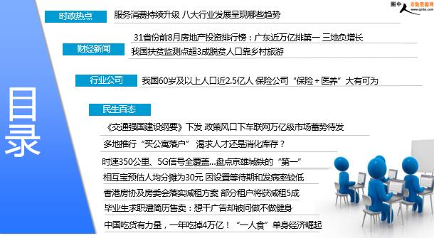 每日新闻速递 2019年9月21日 星期六 目录 时政热点 财经新闻 行业公司 民生百态 服务消费持续升级 八大行业发展呈现哪些趋势 31省份前8月房地产投资排行榜:广东近万亿排第一 三地负增长 我国扶贫监测点超3成脱贫人口靠乡村旅游 我国60岁及以上人口近2.5亿人 保险公司“保险+医养”大有可为 《交通强国建设纲要》下发 政策风口下车联网万亿级市场蓄势待发 多地推行“买公寓落户” 渴求人才还是消化库存? 时速350公里、5G信号全覆盖…盘点京雄城铁的“第一” 相互宝预估人均分摊为30元 因设置等待期和发病率较低 香港房协及房委会落实减租方案 部分租户将获减租5成 毕业生求职遭简历售卖:想干广告却被问做不做健身 中国吃货有力量,一年吃掉4万亿!“一人食”单身经济崛起 时政热点 服务消费持续升级 八大行业发展呈现哪些趋势 2019-09-20 07:59 来源:中国商网 从生存型到发展型,从同质、单一到个性、多元,随着收入和供给质量的提升,我国居民消费正从实物型向服务型转变,服务消费持续升级,已然占据了居民消费的“半壁江山”。国家统计局发布的数据显示,2019年上半年,在全部居民最终消费支出中,服务消费占比为49.4%,比上年同期提高0.6个百分点。根据2017年国民经济行业分类与代码(GB/T 4754-2017)标准,入围榜单的企业在行业大类上总计八类:批发和零售业,房地产业,交通运输仓储和邮政业,住宿和餐饮业,信息传输、软件和信息技术服务业,制造业,文化体育和娱乐业,教育业。 财经新闻 31省份前8月房地产投资排行榜:广东近万亿排第一 三地负增长 2019年09月20日 07:51 来源:中新经纬 2019年1-8月份,全国房地产开发投资84589亿元,同比增长10.5%。房地产投资增速尽管仍处在高位,但比1-7月份回落0.1个百分点,已经连续4个月下降,创2019年以来最低增速。日前,国家统计局公布31省份前8月房地产开发投资情况。从房地产投资累计值来看,1-8月份,广东、江苏、浙江始终保持领先,广东以9820.94亿元稳居第一,江苏以8139.47亿元尾随其后。