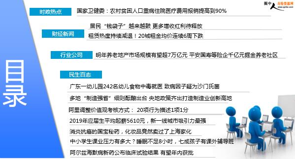 每日新闻速递 2019年9月24日 星期二 目录 时政热点 财经新闻 行业公司 民生百态 国家卫健委:农村贫困人口重病住院医疗费用报销提高到90% 居民“钱袋子”越来越鼓 更多增收红利待释放 租赁热度持续减退!20城租金均价连续6周下跌 明年养老地产市场规模有望超7万亿元 平安国寿等险企千亿元掘金养老社区 广东一幼儿园242名幼儿食物中毒就医 致病因子疑为沙门氏菌 多地“制造强省”细则酝酿出台 央地政策齐出打造制造业创新高地 阿里调整价值观考核方式: 20项行为描述1项1分 2019年应届生平均起薪5610元,新一线城市吸引力最强 消炎抗癌的国宝秘药,化妆品竟然卖过了上海家化 中小学生课业压力有多大?睡眠不足8小时,七成孩子有课外辅导班 阿尔兹海默病新药公布临床试验结果 有望年内获批 时政热点 国家卫健委:农村贫困人口重病住院医疗费用报销提高到90% 2019-09-23 12:27 来源:澎湃新闻网 国家卫生健康委举行新闻发布会,介绍健康扶贫和贫困地区健康促进工作情况。国家卫生健康委扶贫办专职副主任曾云光表介绍,根据党中央、国务院脱贫攻坚决策部署,国家卫生健康委主要承担牵头负责健康扶贫和定点帮扶吕梁山片区的山西省大宁县、永和县和陕西省清涧县、子洲县4个国家级贫困县脱贫攻坚工作。其中,就国家卫健委扶贫相关工作,曾云光提到,深入推进健康扶贫,努力实现贫困人口基本医疗有保障。一方面,坚持保基本、兜底线的原则,按照贫困人口大病、重病住院医疗费用报销比例达到90%、贫困人口县域内就诊率达到90%“两个90%”的工作思路,供需两侧同步发力,推动基本医疗卫生服务公平可及。 财经新闻 居民“钱袋子”越来越鼓 更多增收红利待释放 2019-09-23 10:14 来源:经济参考报 新中国成立70年来,随着我国经济总量大幅提高,居民“钱袋子”也越来越鼓。从脱贫到致富,人民群众幸福感正不断增强。中国减贫速度明显快于全球,对全球减贫贡献超过70%,为解决人类发展中的贫困问题提供了中国智慧和中国方案;中国已经形成世界上最大的中等收入群体,人均国民总收入高于中等收入国家平均水平。目前,收入分配改革仍在深入推进,新一轮居民增收方案将抓紧出台实施,更多增收红利将不断释放。新中国成立前,国家积贫积弱,人民贫困如洗。20世纪50年代到70年代,城乡居民生活有所改善,但农村贫困问题始终突出。按照2010年标准,1978年末我国农村贫困人口7.7亿人,农村贫困发生率高达97.5%。改革开放以来,随着农业、农村改革不断深入和扶贫开发大力推进,我国贫困人口大幅减少。