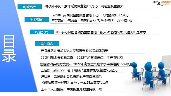 每日新闻速递 2019年9月25日 星期三 目录 时政热点 财经新闻 行业公司 民生百态 财政部部长:累计减税降费超1.3万亿,制造业获益最大 2018年我国现金捐赠总额破千亿,人均捐赠103.14元 互联网的中国速度:网民达8.54亿 数字经济占GDP超1/3 800多万保险营销员生态图谱:新人占比约四成 大进大出是常态 养老金累计结余5万亿 将加快养老保险全国统筹 22部门规划养老新蓝图:2022年所有街道建一个养老机构 癌症防治实施方案发布 2022年高发重点癌早诊率将达到55%以上 工信部:到2025年老年用品产业总体规模超过5万亿元 好消息!无偿献血者临床用血费用直接减免 《95后夜猫子报告》出炉:三成95后熬夜到1点 上半年人口摸底:中国新生儿数量持续下降 时政热点 财政部部长:累计减税降费超1.3万亿,制造业获益最大 2019-09-24 10:14 来源:新京报 庆祝中华人民共和国成立70周年活动新闻中心在梅地亚中心二层新闻发布厅举办第一场新闻发布会。财政部部长刘昆介绍,目前已累计减税降费超过1.3万亿元,其中,制造业获益最大。刘昆表示,减税降费是今年积极财政政策的大事。中国今年减税降费规模空前,包括深化增值税改革、降低社保费率、清理行政性收费等,惠及面非常广,几乎所有企业都能受益。刘昆介绍,按照今年的政府工作报告,全年要减税降费2万亿元。从现在的情况看,累计减税降费超过了1.3万亿元,这里面,制造业获益是最大的。至于减税效果,刘昆表示,市场主体、消费者、纳税人最清楚。社会上普遍反应,今年实施的政策最有效、最公平。减税红利中七成以上用于企业研发、扩大再生产,明显带动企业增加研发投入。 财经新闻 2018年我国现金捐赠总额破千亿,人均捐赠103.14元 2019-09-24 09:17 来源:观察者网 中国慈善联合会在第七届中国慈展会上发布《2018年度中国慈善捐助报告》,发布会由中慈联副秘书长张晓青主持,中慈联副会长兼秘书长刘福清致辞,研究部主任马天昊解读报告数据,来自政府部门、慈善组织、学界、媒体等近200人参会。《报告》显示,2018年全国接收国内外款物捐赠1624.15亿元人民币,其中,我国内地全年捐赠1439.15亿元,香港约160亿元,澳门约25亿元(台湾尚无权威统计数据)。由于抗癌药品捐赠减少,我国内地捐赠总额较2017年小幅下降4.05%,捐赠额占GDP总量比例为0.16%,人均捐赠103.14元,但现金捐赠总额突破1000亿元,创历史新高。