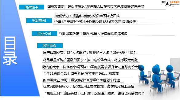 每日新闻速递 2019年9月26日 星期四 目录 时政热点 财经新闻 行业公司 民生百态 国家发改委:确保年底1亿非户籍人口在城市落户取得决定性进展 减税给力!报告称增值税税负率下降近四成 今年1月至8月全国社会物流总额188.6万亿元 增速趋缓 互联网寿险渐行渐近 代理人渠道面临惊涛骇浪 国庆假期或有近8亿人次出游,哪些地方人多?如何规划行程? 药品带量采购扩围激烈厮杀:拟中选价降六成,药企感叹太刺激 猪肉的大事:价格有小幅下降 中国肉类需求飙升带动全球肉价大涨 今年31省份全部上调养老金 官方重申确保足额发放 新中国成立70周年群众游行:10万群众70组彩车行进 优秀月嫂月薪2万: 家政业用工需求倍增,高学历月嫂上热搜 “刷脸支付”迎巨头数十亿补贴:双胞胎、照片、整容也能解锁吗? 时政热点 国家发改委:确保年底1亿非户籍人口在城市落户取得决定性进展 2019-09-24 20:10 来源:新华社 国家发展改革委规划司在广东省东莞市召开现场推进会,通过现场观摩、典型经验介绍等方式,督促农业转移人口市民化任务较重的地区全面落实1亿非户籍人口在城市落户政策,并于今年年底取得决定性进展,切实提高农业转移人口市民化质量。会上,国家发展改革委规划司相关负责人强调,要坚持问题导向、目标导向,按照存量优先原则,进一步压实责任、狠抓落实,充分保障重点群体便捷落户,加大户籍制度改革力度,增强“人钱挂钩”力度和“人地挂钩”精准度,健全农村“三权”维护和自愿有偿退出机制,持续优化以居住证为载体的城镇公共服务提供机制,确保有能力、意愿强的农业转移人口应落尽落,推动1亿非户籍人口在城市落户今年取得决定性进展。 财经新闻 减税给力!报告称增值税税负率下降近四成 2019-09-25 12:37:36 来源:第一财经 今年2万亿元减税降费新政中,增值税减税占了近一半,成为减税主力军。增值税减税新政从4月1日开始实施,将适用16%税率的工商业改按13%税率征税,将适用10%税率的部分服务业改按 9%税率征税,对适用6%税 率的服务业维持税率不变,但允许生产、生活服务业纳税人按当期可抵扣进项税 额的 10%加计抵减应纳税额。同时,将国内旅客运输服务纳入抵扣范围,将取得不动产支付的进项税由分两年抵扣改为一次性全额抵扣,并将符合条件的纳税人新增留抵税额予以退还。根据国家税务总局数据,今年四五六三个月增值税减税新政分别减税1113 亿元、1105 亿元和 967 亿元。为了反映减税幅度,报告测算出这三个月的减税率,分别约26%、23%、15%。
