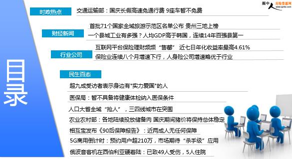 每日新闻速递 2019年9月27日 星期五 目录 时政热点 财经新闻 行业公司 民生百态 交通运输部:国庆长假高速免通行费 9座车暂不免费 首批71个国家全域旅游示范区名单公布 贵州三地上榜 一个县城工业有多强?人均GDP高于韩国,连续14年百强县第一 互联网平台保险理财频频“售罄” 近七日年化收益率最高4.61% 保险业连续八个月增速下行,人身险公司增速略优于行业 超九成受访者表示身边有"实力爱国"的人 医保局:暂不具备将健康体检纳入医保条件 人口大省全域“抢人”,三四线城市在突围 农业农村部:各地陆续投放储备肉 国庆期间猪价将保持总体稳定 相互宝发布《90后保障报告》:近两成人无任何保障 5G商用倒计时:预约用户超210万,市场期待“杀手级”应用 俄波音客机在西伯利亚硬着陆:已致49人受伤,5人住院 时政热点 交通运输部:国庆长假高速免通行费 9座车暂不免费 2019-09-26 11:10 来源:央视新闻 交通运输部新闻发言人孙文剑表示,关于十一期间小客车免费通行政策的问题,根据《国务院关于批转交通运输部等部门重大节假日免收小型客车通行费实施方案的通知》,今年国庆假期全国收费公路将继续免收7座及以下小型客车通行费,具体时间为:从10月1日零时起,至10月7日24时结束。在此期间,普通公路以车辆通过收费站的时间为准,高速公路以车辆驶离出口收费站的时间为准。在这里我要向记者朋友们再次解释一下:今年5月,我部发布了新修订的《收费公路车辆通行费车型分类》标准,7月,我部印发通知,明确从2020年1月1日起执行新的收费标准,所以这次十一长假免费车辆的范围还是7座以下(含7座)载客车辆以及允许在普通收费公路上行驶的摩托车。 财经新闻 首批71个国家全域旅游示范区名单公布 贵州三地上榜 2019-09-26 13:20 来源:央广网 首批71个国家全域旅游示范区名单近日在文化和旅游部官网正式公布,贵州省的贵阳市花溪区、遵义市赤水市、六盘水市盘州市入选。今年上半年,文化和旅游部启动首批国家全域旅游示范区创建单位验收认定工作。经过地方初审验收,文化和旅游部采取会议评审和第三方检查的方式,对全国96家创建单位进行了认定。经过公示,全国共有71家创建单位被认定为首批国家全域旅游示范区。此次验收认定的整体通过率约为74%。在主要考核指标包括:旅游业增加值占本地GDP比重15%以上;旅游从业人数占本地就业总数的比重20%以上;年游客接待人次达到本地常住人口数量10倍以上;当地农民年纯收入20%以上来源于旅游收入等方面。