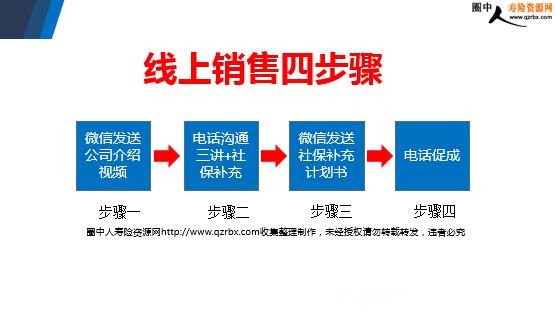线上销售四步骤 新人育成——创业启航班 微信发送公司介绍视频 电话沟通三讲+社保补充 微信发送社保补充计划书 电话促成 线上销售四步骤 步骤一 步骤二 步骤三 步骤四 步骤一:微信发送公司介绍视频 选择恰当的时间(客户不忙的情况下)微信发送公司介绍视频给客户如果客户没有回复,就隔一天再发一个视频 介绍公司,提升公信力 微信发送视频 步骤一:微信发送公司介绍视频 步骤二:电话沟通三讲 1. (等客户回复后)打电话客户:“叔叔/阿姨,您好!我刚刚给您发了我们公司的介绍视频,您已经看了吧?” 2. 切入三讲(简易版) 为什么做保险 1. xx一直致力于开拓综合金融,2016年控股了广发银行,更是进一步深化了综合金融趋势。公司近年一直致力于去培养综合金融人才,满足客户的综合金融需求。 2. 我非常认可xx以及保险行业的发展趋势,并且通过自己的努力最终面试成功,进入了xx成为一名营销员! 讲 自 己 步骤二:面谈讲三讲 1. 副部级央企的保险企业-xx 2. 2019年最新世界500强排名51位 3. 年度业绩稳居行业第一 4. xx品牌价值居行业第一 5. 市场覆盖率排名第一 6. 国内最大的机构投资者,总资产突破三万亿 7. 唯一一家三地上市的保险企业
