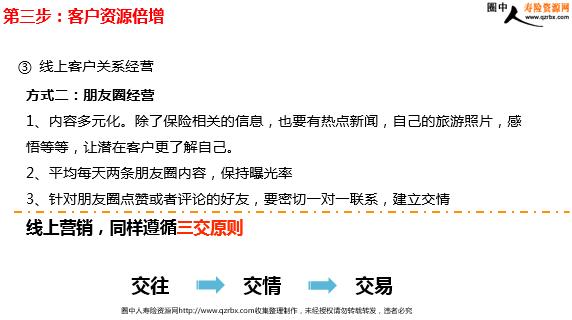 线上(微信)销售生态圈的建立教学 大客户投资渠道多,过往依赖大单销售的模式难以为继过于依赖个别客户,影响伙伴的经营稳定性保险主推险种由分红险转为健康保障型产品 保险主攻险种的转变影响营销员销售模式的转变 批发销售需要大量的客户资源,从哪里来? 大单销售 保单批发销售 传统展业 一天到晚在外面跑,拜访的数量还是有限 速度慢效率低 线上展业 是否想要度假的时候也可以展业? 线上展业 想要遛狗也不耽误展业…… 线上展业 恶劣天气也不用怕…… 线上展业 是时候 做些改变了…… 线上展业 微信,让全世界都听到你的声音 微信平台数据 月活跃用户数突破7亿! 一线城市微信渗透率超过90% 人均微信好友数超过120人 巨大的市场亟待开发 高温、台风……通通都不怕,开拓客户不受气候影响 通过朋友圈了解客户喜好等信息 节约时间、金钱成本,批量获取客户 利用朋友圈展现自己,赢得客户认同 微信开拓客户的好处 传统微信开拓:线下认识好友 → 添加微信 客户“微”开拓:线上添加 → 线上裂变 微信开拓模式转变