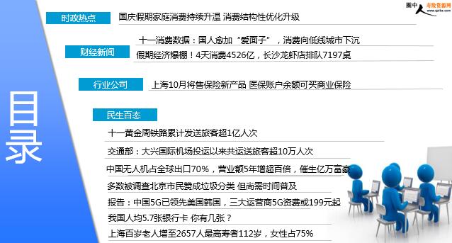 每日新闻速递 2019年10月8日 星期二 目录 时政热点 财经新闻 行业公司 民生百态 国庆假期家庭消费持续升温 消费结构性优化升级 十一消费数据:国人愈加“爱面子”,消费向低线城市下沉 假期经济爆棚!4天消费4526亿,长沙龙虾店排队7197桌 上海10月将售保险新产品 医保账户余额可买商业保险 十一黄金周铁路累计发送旅客超1亿人次 交通部:大兴国际机场投运以来共运送旅客超10万人次 中国无人机占全球出口70%,营业额5年增超百倍,催生亿万富豪 多数被调查北京市民赞成垃圾分类 但尚需时间普及 报告:中国5G已领先美国韩国,三大运营商5G资费或199元起 我国人均5.7张银行卡 你有几张? 上海百岁老人增至2657人最高寿者112岁,女性占75% 时政热点 国庆假期家庭消费持续升温 消费结构性优化升级 2019-10-7 10:49 来源:中新网 ——爱吃:黄金周前三天,阿里线上牛排成交额同比增长60%,超300万人次在天猫超市抢购茅台酒,白酒成交额同比增速达12倍。 ——爱美:国人也越来越“爱面子”。天猫数据显示,10月1日至3日,芳疗精油成交同比大涨239.64%,香水成交额同比增长50.59%,男士彩妆成交额同比增长69.91%,防晒霜成交同比增长79.30%。 ——爱玩:背起行囊,去远方看看,是“十一”假期主流度假方式。 财经新闻 十一消费数据:国人愈加“爱面子”,消费向低线城市下沉 2019-10-06 07:08 来源:新京报 10月6日,阿里巴巴集团发布了《2019“十一”黄金周消费数据报告》,数据显示,今年国庆假期,线上消费呈现精致化、高效化、智能化趋势,出门旅游仍是人们的主流度假方式。总体来看,消费和旅游均有从境外向境内回流、由一二线城市向低线城市下沉的趋势。时尚领域,最值得关注的是美容、美妆方面的消费增长。天猫数据显示,10月1日至3日,芳疗精油成交额同比大涨239.64%,香水成交额同比增长50.59%,男士彩妆成交额同比增长69.91%,防晒霜成交额同比增长79.30%。长假前夕,用于晒伤修复和补水保湿的医用面膜呈现出510%的同比增长。不难看出,国人对于“面子消费”的投入逐渐增多。