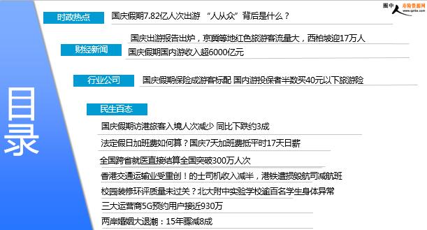 每日新闻速递 2019年10月9日 星期三 目录 时政热点 财经新闻 行业公司 民生百态 国庆假期7.82亿人次出游 “人从众”背后是什么? 国庆出游报告出炉,京冀等地红色旅游客流量大,西柏坡迎17万人 国庆假期国内游收入超6000亿元 国庆假期保险成游客标配 国内游投保者半数买40元以下旅游险 国庆假期访港旅客入境人次减少 同比下跌约3成 法定假日加班费如何算?国庆7天加班费抵平时17天日薪 全国跨省就医直接结算全国突破300万人次 香港交通运输业受重创!的士司机收入减半,港铁遭损毁航司减航班 校园装修环评质量未过关?北大附中实验学校逾百名学生身体异常 三大运营商5G预约用户接近930万 两岸婚姻大退潮:15年骤减8成 时政热点 国庆假期7.82亿人次出游 “人从众”背后是什么? 2019-10-08 07:22 来源:中国新闻网 在2019年的最后一个法定节假日,国人的旅游热情充分释放。经文化和旅游部综合测算,2019年国庆七天全国共接待国内游客7.82亿人次,同比增长7.81%;实现国内旅游收入6497.1亿元,同比增长8.47%。其中,10月7日全国接待国内游客5097.3万人次,同比增长8.78%,实现国内旅游收入407.8亿元,同比增长10.34%。在出境游方面,国庆假期,全国口岸日均出入境旅客达到198万人次,7天合计出境游突破700万人次。 财经新闻 国庆出游报告出炉,京冀等地红色旅游客流量大,西柏坡迎17万人 2019年10月08日 13:17 来源:北京晚报 文化和旅游部昨晚发布测算数据,国庆七天全国共接待国内游客7.82亿人次,同比增长7.81%,实现国内旅游收入6497.1亿元,同比增长8.47%。值得一提的是,红色旅游成为国庆假日旅游市场主旋律。今年是新中国成立70周年,首都北京成为今年黄金周红色旅游客流量最大的目的地。拥有大量红色旅游资源的河北也迎来客流高峰,17万人踏上革命圣地西柏坡。