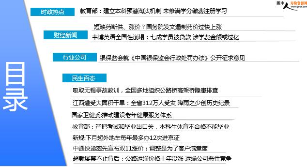每日新闻速递 2019年10月13日 星期日 目录 时政热点 财经新闻 行业公司 民生百态 教育部:建立本科预警淘汰机制 未修满学分缴费注册学习 短缺药断供、涨价?国务院发文遏制药价过快上涨 韦博英语全国性崩塌:七成学员被贷款 涉学费金额或过亿 银保监会就《中国银保监会行政处罚办法》公开征求意见 吸取无锡事故教训,全国多地组织公路桥高架桥隐患排查 江西遭受大面积干旱:全省312万人受灾 降雨之少创历史纪录 国家卫健委:推动建设老年健康服务体系 教育部:严把考试和毕业出口关,本科生体育不合格不能毕业 新规:下月起外地车每年最多办12次进京证 中通快递率先宣布双11涨价:调整是为了客户满意度 超载屡禁不止背后:公路运输价格十年没涨 运输公司恶性竞争 时政热点 教育部:建立本科预警淘汰机制 未修满学分缴费注册学习 2019-10-12 10:21 来源:中国新闻网 日前,教育部发布关于深化本科教育教学改革全面提高人才培养质量的意见。文件要求,完善学分标准体系,严格学分质量要求,建立学业预警、淘汰机制。学生在基本修业年限内修满毕业要求的学分,应准予毕业;未修满学分,可根据学校修业年限延长学习时间,通过缴费注册继续学习。 财经新闻 短缺药断供、涨价?国务院发文遏制药价过快上涨 2019-10-12 07:23 来源:中国新闻网 如何能及时发现短缺药供应出现的问题?提高监测应对的灵敏度和及时性是本次公布的《意见》中一项重要内容。文件提出,要搭建国家短缺药品多源信息采集平台。具体来看,就是国家短缺药品供应保障工作会商联动机制牵头单位会同工业和信息化、医疗保障、药品监督管理等各相关部门建立协同监测机制,实现原料药和制剂在注册、生产、采购、价格等方面的信息联通共享,细化可操作的监测和预警标准,实时动态监测预警并定期形成监测报告,加强协同应对。此外,文件中还提出做好短缺药品清单管理。根据要求,国家和省级联动机制牵头单位分别会同各成员单位制定国家和省级临床必需易短缺药品重点监测清单和短缺药品清单并动态调整。