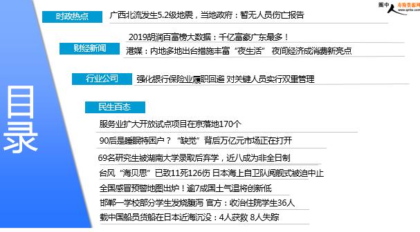 每日新闻速递 2019年10月14日 星期一 目录 时政热点 财经新闻 行业公司 民生百态 广西北流发生5.2级地震,当地政府:暂无人员伤亡报告 2019胡润百富榜大数据:千亿富豪广东最多! 港媒:内地多地出台措施丰富“夜生活” 夜间经济成消费新亮点 强化银行保险业履职回避 对关键人员实行双重管理 服务业扩大开放试点项目在京落地170个 90后是睡眠特困户?“缺觉”背后万亿元市场正在打开 69名研究生被湖南大学录取后弃学,近八成为非全日制 台风“海贝思”已致11死126伤 日本海上自卫队阅舰式被迫中止 全国感冒预警地图出炉!逾7成国土气温将创新低 邯郸一学校部分学生发烧腹泻 官方:收治住院学生36人 载中国船员货船在日本近海沉没:4人获救 8人失踪 时政热点 广西北流发生5.2级地震,当地政府:暂无人员伤亡报告 2019-10-13 00:33 来源:新京报 10月12日22时55分,广西北流市发生5.2级地震,众多当地市民感受到震感后到马路等宽阔平台的地方避险。当日23时20分,新京报记者从北流市政府办公室了解到,由于地震刚刚发生,暂未收到全市范围内房屋财产损失和是否有人员伤亡的信息。北流市政府办公室一名工作人员表示,目前全市各部门正在核实收集相关情况:“我刚刚也感觉到震感了,但不是很强烈”。中国地震台网正式测定,10月12日22时55分在广西北流市发生5.2级地震,震源深度10千米,震中位于北纬22.18度,东经110.51度。中国地震台网中心发布的震中地形图显示,此次地震周边5公里内有平田村、黄田村、坡头村、茶山村等,周边多为山地。 财经新闻 2019胡润百富榜大数据:千亿富豪广东最多! 2019-10-13 10:34 来源:时代周报 近日,胡润研究院发布了第21次“胡润百富榜”,从榜单大数据来看,今年上榜的企业家有1819位。