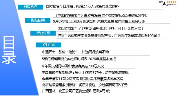 每日新闻速递 2019年10月16日 星期三 目录 时政热点 财经新闻 行业公司 民生百态 国考报名今日开始:拟招2.4万人 政策向基层倾斜 《中国的粮食安全》白皮书发表 两个重要指标双双超过6.5亿吨 9月CPI同比上涨3% 创2013年来最大涨幅 猪肉价格上涨69.3% 银保监局出手了!整治互联网保险业务,网上巨头慌不慌? 沪职工医保购买商业险新增两款产品,百万医疗险最高续保至100周岁 中通双十一涨价“抢跑”,快递同行按兵不动 5部门明确国资充实社保时间表 2020年底基本完成 今年国庆期间中国出境游客突破700万人次 中国白领午餐鄙视链:每天工作时间越长,对午餐就越重视 今年天猫双11首次可买房 阿里拍卖房源覆盖多地学区房 北京垃圾管理条例修订:餐厅外卖送一次性餐具可罚5千元 广西玉林一化工公司厂区发生爆炸 已致4死3伤 时政热点 国考报名今日开始:拟招2.4万人 政策向基层倾斜 2019-10-15 10:53 来源:中国新闻网 2020年度国考网上报名今日8时正式启动,本次国考共计划招录2.4万人,涉及中央和国家机关86个单位、23个直属机构。本次国考招考政策和录用计划向基层一线倾斜,鼓励引导优秀高校毕业生报考基层职位。此外,招考公告明确被开除党籍人员、失信联合惩戒对象等不得报考。 财经新闻 《中国的粮食安全》白皮书发表 两个重要指标双双超过6.5亿吨 2019年10月15日 09:51 来源:央视新闻 昨天(14日)下午,国务院新闻办发表《中国的粮食安全》白皮书,这是继1996年后,中国政府发表的第二部粮食白皮书。白皮书突出强调了国家粮食安全是头等大事的战略定位,体现了以人民为中心的发展思想;集中展现了保障国家粮食安全的伟大成就,彰显在中国共产党领导下依靠自身力量端好自己饭碗的战略自信。有两个重要指标双双超过6.5亿吨,一是粮食总产量2015年以来稳定在6.5亿吨以上;二是2018年全国共有标准粮食仓房仓容6.7亿吨。白皮书还系统阐述了中国特色粮食安全之路,介绍了国际粮食合作的丰硕成果,展望了未来粮食安全政策举措,为各方提供持续稳定的粮食安全发展预期。