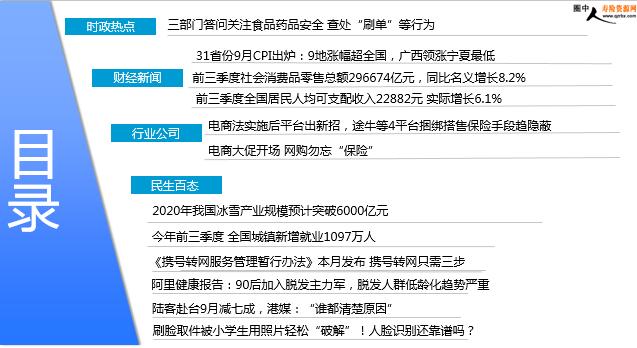每日新闻速递 2019年10月19日 星期六 目录 时政热点 财经新闻 行业公司 民生百态 三部门答问关注食品药品安全 查处“刷单”等行为 31省份9月CPI出炉:9地涨幅超全国,广西领涨宁夏最低 前三季度社会消费品零售总额296674亿元,同比名义增长8.2% 前三季度全国居民人均可支配收入22882元 实际增长6.1% 电商法实施后平台出新招,途牛等4平台捆绑搭售保险手段趋隐蔽 电商大促开场 网购勿忘“保险” 2020年我国冰雪产业规模预计突破6000亿元 今年前三季度 全国城镇新增就业1097万人 《携号转网服务管理暂行办法》本月发布 携号转网只需三步 阿里健康报告:90后加入脱发主力军,脱发人群低龄化趋势严重 陆客赴台9月减七成,港媒:“谁都清楚原因” 刷脸取件被小学生用照片轻松“破解”!人脸识别还靠谱吗? 时政热点 三部门答问关注食品药品安全 查处“刷单”等行为 2019-10-18 07:03 来源:法制日报 近年来,食品药品安全领域出现违法犯罪成本低的问题,引发社会高度关注。“食品安全法、疫苗管理法、药品管理法等相继修订和颁布,进一步加大了对食品药品安全领域违法行为的处罚力度。检察机关要积极推动相关法律落地实施,同时也要依法发挥刑罚功效,加重违法犯罪成本。”郑新俭说。为确保违法犯罪得到有效追究,检察机关在认真履行批捕、起诉职能的同时,一方面,对于涉嫌构成犯罪的行政违法案件,及时监督行政机关移送,切实防止有案不移、以罚代刑,并加强立案监督,防止侦查机关有案不立;另一方面,对于审查起诉中发现不构成犯罪但需要给予行政处罚的案件,在作出不起诉决定的同时,及时提出检察意见,督促行政机关依法作出行政处罚。 财经新闻 31省份9月CPI出炉:9地涨幅超全国,广西领涨宁夏最低 2019年10月18日 13:17 来源:中新经纬 2019年9月份,全国CPI同比上涨3.0%,涨幅进入“3时代”,从环比看,CPI上涨0.9%。分省份来看,广西、四川、海南、广东等9省份9月份CPI同比涨幅超过全国平均水平,黑龙江、山东两地涨幅与全国持平,吉林、河北、宁夏等20省份涨幅低于全国。其中,广西壮族自治区9月份CPI同比上涨4.5%,连续三个月全国领涨;宁夏回族自治区CPI同比上涨1.3%,涨幅全国最低。国家统计局城市司高级统计师沈赟解读称,从同比看,9月份食品中,猪肉价格上涨69.3%,涨幅扩大22.6个百分点,影响CPI上涨约1.65个百分点。牛肉、羊肉、鸡肉、鸭肉和鸡蛋价格涨幅在9.4%—18.8%之间;鲜果价格上涨7.7%,涨幅回落16.3个百分点。上述六项合计影响CPI上涨约0.49个百分点。