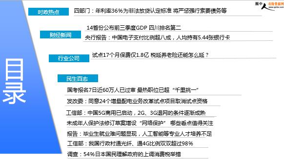每日新闻速递 2019年10月23日 星期三 目录 时政热点 财经新闻 行业公司 民生百态 四部门:年利率36%为非法放贷认定标准 将严惩强行索要债务等 14省份公布前三季度GDP 四川排名第二 央行报告:中国电子支付比例超八成,人均持有5.44张银行卡 试点17个月保费仅1.8亿 税延养老险还能怎么延? 国考报名7日近60万人已过审 最热职位已超“千里挑一” 发改委:同意24个增量配电业务改革试点项目取消试点资格 工信部:中国5G商用已启动,2G、3G退网的条件逐渐成熟 未成年人保护法修订草案增设“网络保护” 哪些看点值得关注 报告:毕业生就业难问题显现,人工智能等专业人才培养不足 工信部:我国行政村通光纤、通4G比例双双超过98% 调查:54%日本国民理解政府的上调消费税举措 时政热点 四部门:年利率36%为非法放贷认定标准 将严惩强行索要债务等 2019年10月22日 06:36 来源:中国网 据最高人民法院消息,近日,最高人民法院、最高人民检察院、公安部、司法部联合印发《关于办理非法放贷刑事案件若干问题的意见》,对非法放贷的认定标准进行了界定。《意见》将打击目标锁定社会危害性最为突出的非法高利放贷,明确在定罪量刑时以单次实际年利率超过36%的非法放贷为基准,并且从非法放贷数额、违法所得数额、非法放贷数量以及所造成的危害后果等几个方面,规定了“情节严重”和“情节特别严重”的具体标准。 财经新闻 14省份公布前三季度GDP 四川排名第二 2019年10月22日 11:36 来源:光明网 近日,各地经济三季报陆续公布。据不完全统计,截至10月21日,至少已有14个省份公布了2019年三季度GDP数据。从前三季度GDP总量看,广东毫无悬念继续位居第一;四川、湖北前三季度GDP总量突破3万亿大关;北京、上海前三季度人均可支配收入超过5万元大关。
