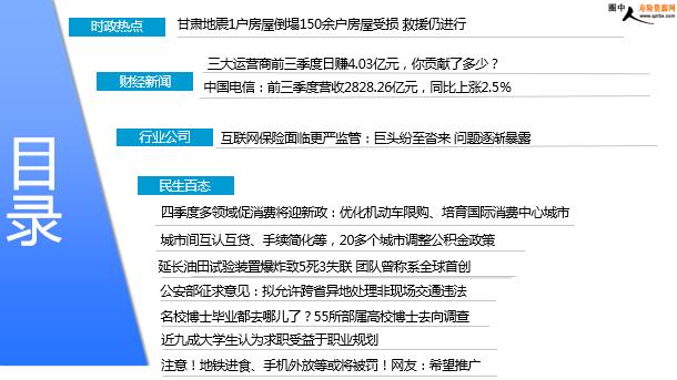 每日新闻速递 2019年10月29日 星期二 目录 时政热点 财经新闻 行业公司 民生百态 甘肃地震1户房屋倒塌150余户房屋受损 救援仍进行 三大运营商前三季度日赚4.03亿元,你贡献了多少? 中国电信:前三季度营收2828.26亿元,同比上涨2.5% 互联网保险面临更严监管:巨头纷至沓来 问题逐渐暴露 四季度多领域促消费将迎新政:优化机动车限购、培育国际消费中心城市 城市间互认互贷、手续简化等,20多个城市调整公积金政策 延长油田试验装置爆炸致5死3失联 团队曾称系全球首创 公安部征求意见:拟允许跨省异地处理非现场交通违法 名校博士毕业都去哪儿了?55所部属高校博士去向调查 近九成大学生认为求职受益于职业规划 注意!地铁进食、手机外放等或将被罚!网友:希望推广 时政热点 甘肃地震1户房屋倒塌150余户房屋受损 救援仍进行 2019年10月28日 12:12 来源:新京报 今日(10月28日)凌晨,甘肃省夏河县发生5.7级地震。新京报记者从甘肃省应急管理厅获悉,据初步统计,地震共造成合作市、夏河县7个乡镇(街道)150余户房屋受损、1户房屋倒塌,无人员伤亡。此前报道,中国地震台网正式测定,今日1时56分,甘肃甘南州夏河县发生5.7级地震,震源深度10千米,震中位于北纬35.10度,东经102.69度,震中位于山区。合作市、夏河县震感强烈,天水市、兰州市有明显震感。记者从甘肃省应急管理厅了解到,地震发生后,省委、省政府高度重视,林铎书记、唐仁健省长批示要求迅速核查灾情,调集专业力量进行救援。据初步统计,地震共造成合作市、夏河县7个乡镇(街道)150余户房屋受损、1户房屋倒塌。 财经新闻 三大运营商前三季度日赚4.03亿元,你贡献了多少? 2019-10-28 10:12 来源:中新经纬 28日午间,中国电信在港交所披露2019年前三季度未经审核的主要财务数据显示,报告期内,中国电信实现经营收入2828.26亿元;股东应占利润为183.89亿元,比去年同期下降3.4%,剔除中国铁塔2018年第三季度上市一次性收益,同比上升2.5%。根据中国移动和中国联通此前公布的数据,中国移动前三季季度实现股东应占利润为818亿元,同比下降13.9%;同期中国联通实现权益持有者应占利润为98.23亿元,比去年同期上升11.9%。据此计算,三大运营商今年前三季度累计实现净利润1100.12亿元,日赚约4.03亿元。中国电信表示,前三季度,集团经营业绩保持稳健增长,经营收入为2828.26亿元,其中服务收入为2714.84亿元,比去年同期上升2.5%。