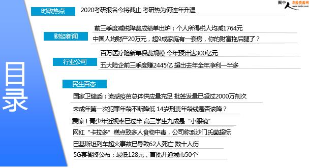 每日新闻速递 2019年11月1日 星期五 目录 时政热点 财经新闻 行业公司 民生百态 2020考研报名今将截止 考研热为何连年升温 前三季度减税降费成绩单出炉:个人所得税人均减1764元 中国人均财产20万元,超9成家庭有一套房,你的财富拖后腿了? 百万医疗险新单保费规模 今年预计达300亿元 五大险企前三季度赚2445亿 超出去年全年净利一半多 国家卫健委:流感疫苗总体供应量充足 批签发量已超过2000万剂次 未成年第一次犯罪年龄不断降低 14岁刑责年龄线是否该降? 震惊!青少年近视率已过半 高三学生九成是“小眼镜” 网红“卡拉多”糕点致多人食物中毒,公司称系沙门氏菌超标 巴基斯坦列车起火事故已导致62人死亡 数十人伤 5G套餐终公布:最低128元,首批开通城市50个 时政热点 2020考研报名今将截止 考研热为何连年升温 2019-10-31 07:09 来源:中国新闻网 自2019年9月24日起,在经历了考研预报名、正式报名后,2020考研报名工作在31日将进入最后时刻。据教育部今年8月发布的《2020年全国硕士研究生招生考试公告》,2020年考研网上正式报名时间为2019年10月10日至10月31日,每天9:00-22:00。伴随着考研报名进行,“考研热”的话题又再度成为舆论焦点。从数据来看,考研大军的规模近年来不断壮大,名校竞争也变得更为激烈。“考研热”有着现实的数据支持。统计数据显示,自2011年以来,中国考研报名人数除在2014、2015年稍有下降,其余年份都呈增加态势,2017、2018年增幅更在10%以上。 财经新闻 前三季度减税降费成绩单出炉:个人所得税人均减1764元 2019-10-31 11:44:25 来源:中国青年报 国家税务总局30日公布今年前三季度减税降费数据。前三季度,全国累计新增减税降费17834亿元,其中新增减税15109亿元,新增社保费降费2725亿元。新增减税中个人所得税两步改革叠加新增减税4426亿元,累计人均减税1764元。国家税务总局减税办常务副主任、收入规划核算司司长蔡自力表示,今年实施更大规模减税降费政策对税收收入的减收影响较为明显。前三季度全国税务部门组织税收收入(已扣除出口退税)112658亿元,增长0.3%,增幅比去年同期回落12.9个百分点。前三季度,各行业门类税负水平,同比均实现不同程度的下降。比如,制造业新增减税4738亿元,占新增减税总额的31.36%,行业税负同比下降1.08个百分点。