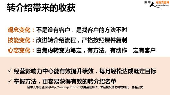 掌握转介绍 展业更轻松 CONTENTS 目 录 利用影响力中心 实作得收获 向绩优成长 客户来源 更依赖于缘故客户偶尔也有转介绍客户 反思过去 学习力不够态度不够坚决,常做无效的努力没有适合自己且高效的客户开拓方法转介绍只是随口一说,没有后期跟进,流失过客户 转介绍再升级 寿险生涯的新起点:终于有了一种有效的客户开拓、经营方法 重新认识“转介绍”的重要性思想上转变:由被动变为主动思路更清晰,学到有效方法整理100个老客户名单,找到潜在影响力中心 经营影响力中心能有效提升绩效,每月轻松达成既定目标 掌握方法,更容易获得有效的转介绍名单 转介绍带来的收获 观念变化:不是没有客户,是找客户的方法不对技能变化:改进转介绍流程,严格按照课件复制心态变化:由焦虑转变为笃定,有方法、有动作一定有客户