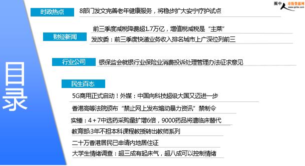 每日新闻速递 2019年11月2日 星期六 目录 时政热点 财经新闻 行业公司 民生百态 8部门发文完善老年健康服务,将稳步扩大安宁疗护试点 前三季度减税降费超1.7万亿,增值税减税是“主菜” 发改委:前三季度快递业务收入排名城市上广深位列前三 银保监会就银行业保险业消费投诉处理管理办法征求意见 5G商用正式启动!外媒:中国向科技超级大国又迈进一步 香港高等法院颁布“禁止网上发布煽动暴力资讯”禁制令 实锤:4+7中选药采购量扩增6倍,9000药品将遭临床替代 教育部:3年不担本科课程教授转出教师系列 二十万香港居民已申请内地居住证 大学生情绪调查:超三成有起床气,超八成可以控制情绪 时政热点 8部门发文完善老年健康服务,将稳步扩大安宁疗护试点 2019年11月1日11:10 来源:新京报 国家卫健委等8部门日前联合印发《关于建立完善老年健康服务体系的指导意见》,针对广受关注的安宁疗护问题,国家卫生健康委老龄健康司司长王海东今日(11月1日)表示,下一步,我国将稳步扩大安宁疗护试点。王海东表示,为完善老年健康服务体系,我国将推动医疗卫生机构开展安宁疗护服务,探索建立机构、社区和居家安宁疗护相结合的工作机制,形成畅通合理的转诊制度,稳步扩大安宁疗护试点。北京海淀医院安宁疗护病房主任秦苑表示,参照世界卫生组织的评价标准,我国的安宁疗护整体还处在起步阶段。她表示,我国在学科建设、人才建设、配套政策等多个方面都需要共同推进。“包括社会的‘生死教育’、现代的临终关怀理念、怎样是有尊严地离去……这些教育在全民教育中还刚刚起步。” 财经新闻 前三季度减税降费超1.7万亿,增值税减税是“主菜” 2019-11-1 09:43 来源:界面新闻 官方最新公布的一项数据列出了中国前三季度在减税降费上取得的成果。国家税务总局周三发布的数据显示,1-9月,全国累计新增减税降费17834亿元,其中新增减税15109亿元,新增社保费降费2725亿元。去年下半年以年,全球经济放缓叠加中美贸易摩擦不断升温,国内外需求持续萎缩,制造业采购经理人指数(PPI)和工业企业利润始终低迷,这令中国经济持续承压。在此背景下,减税降费成为政府提振经济的“法宝”,也是中国推行的积极财政政策的头等大事。政府希望以此提振企业信心、刺激居民消费,从而对冲经济继续下滑风险。