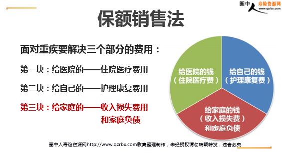 高保额销售手抄内容(二) 五年生存率是医学界为了统计癌症病人的存活率,比较各种治疗方法的优缺点,采用大部分患者愈后比较明确的情况作为的统计指标; 癌症治疗的五年生存率是医生用来评价手术和治疗效果的,如果癌症患者经手术治疗能生存5年以上,即可认为肿瘤被治愈的可能性为90%,甚至接近治愈。 什么是五年生存率? 不仅是医学界五年生存率也是保险业关注的焦点之一 重疾险的核心是解决五年生存率的问题 普及筛查难,一旦发现多已晚期 治疗的规范程度不同,一些新药使用限制 后期康复重视不足,财务支持跟不上 五年生存率差距为何如此之大 康复在提高病患的生活质量上有着不可替代的作用。但目前我国对康复重视度不够,在养病和养家之间往往不能兼顾,在康复期内不得不又开始从事正常工作,耽误了正常了康复治疗,导致5年存活率更低。 重疾险不是为医疗费而买而是为了五年康复期而买 虽然医疗技术不断发展财务也要跟上,有钱才能支撑康复 面对重疾要解决三个部分的费用:第一块:给医院的——住院医疗费用第二块:给自己的——护理康复费用第三块:给家庭的——收入损失费用 和家庭负债 保额销售法