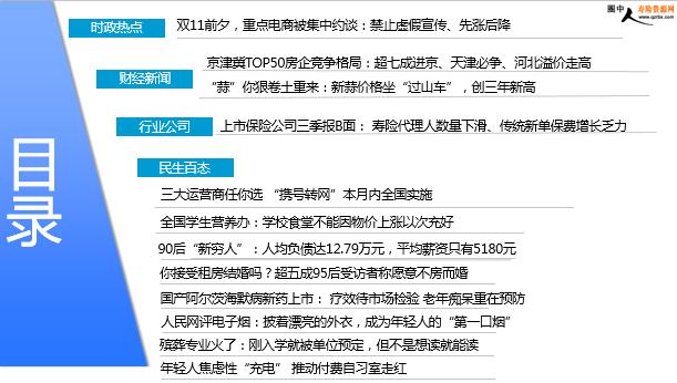 每日新闻速递 2019年11月6日 星期三 目录 时政热点 财经新闻 行业公司 民生百态 双11前夕,重点电商被集中约谈:禁止虚假宣传、先涨后降 京津冀TOP50房企竞争格局:超七成进京、天津必争、河北溢价走高 “蒜”你狠卷土重来:新蒜价格坐“过山车”,创三年新高 上市保险公司三季报B面: 寿险代理人数量下滑、传统新单保费增长乏力 三大运营商任你选 “携号转网”本月内全国实施 全国学生营养办:学校食堂不能因物价上涨以次充好 90后“新穷人”:人均负债达12.79万元,平均薪资只有5180元 你接受租房结婚吗?超五成95后受访者称愿意不房而婚 国产阿尔茨海默病新药上市: 疗效待市场检验 老年痴呆重在预防 人民网评电子烟:披着漂亮的外衣,成为年轻人的“第一口烟” 殡葬专业火了:刚入学就被单位预定,但不是想读就能读 年轻人焦虑性“充电” 推动付费自习室走红 时政热点 双11前夕,重点电商被集中约谈:禁止虚假宣传、先涨后降 2019年11月05日 10:53 来源:澎湃新闻 两场针对双11的会议上,同被提到的关键词是“宣传”。在上海,相关部门通报了今年以来网络市场发展和监管情况,排在第一位的是“虚假宣传”。会议指出,社交笔记、视频直播、网红导购中的一些电商主播为了博眼球,冲销量,对商品做虚假宣传,甚至以诋毁竞争对手商誉的方式变相抬高自己。北京市市场监管局则在网络广告宣传方面,要求平台企业强化互联网广告管理,全面履行对促销广告的检查核验义务,禁止发布内容不符或证明材料不全的广告,禁止发布处方药、烟草类广告,显著区分付费搜索广告与自然搜索结果。此外,电商平台企业在集中促销活动期间要及时发现并制止虚构原价、先涨后降、不履行价格承诺等违法行为,认真履行明码标价义务。 财经新闻 京津冀TOP50房企竞争格局:超七成进京、天津必争、河北溢价走高 2019-11-5 06:29 来源:丁祖昱评楼市 2015年国家审议通过了《京津冀协同发展规划纲要》,在政策利好的带动下,房地产市场开始加速运行。从TOP50房企进驻北京情况来看,北京市场主要由当地国企与品牌房企分食,TOP50房企中超7成已进京布局。这一方面是由于北京市场地价较高,对企业体量提出要求,因此当地国企和品牌房企凭借资金优势更容易进场,包括合作拿地等在北京市场也层出不穷。另一方面则因为北京作为首都,市场方面虽然政策偏紧但影响力较广,具有天然的宣传优势,因此多家企业都把进驻北京作为战略规划之一,通过进驻北京拓展版图同时打造标杆型项目。