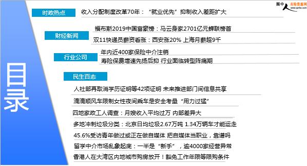 每日新闻速递 2019年11月8日 星期五 目录 时政热点 财经新闻 行业公司 民生百态 收入分配制度改革70年:“就业优先”抑制收入差距扩大 福布斯2019中国富豪榜:马云身家2701亿元蝉联榜首 双11快递员薪资看涨:西安涨20% 上海月薪超9千 年内近400家保险中介注销 寿险保费增速先扬后抑 行业面临转型阵痛期 人社部再取消学历证明等42项证明 未来推进部门间信息共享 滴滴顺风车限制女性夜间乘车是安全考量“用力过猛” 四地家政工人调查:月嫂收入平均过万 内部差异大 多地冲刺垃圾分类:北京日均垃圾2.67万吨 1.34万辆车才能运走 45.6%受访青年做过或正在做自媒体 把自媒体当职业,靠谱吗 留学中介市场乱象起底:一半是“新手”,逾4000家经营异常 香港人在大湾区内地城市购房放开!豁免工作年限等限购条件 时政热点 收入分配制度改革70年:“就业优先”抑制收入差距扩大 2019-11-07 07:44 来源:新京报 新中国成立的70年,中国经济发生了翻天覆地变化。这一期间,中国从一个极端贫困的国家成长为一个人均收入接近1万美元的经济体。这是中国经济发展史上的一项辉煌成就。新中国70年的经济发展过程可以分为两个阶段,前30年和后40年。两个阶段除了经济增长速度的差别外,还存在着经济模式的差异,主要反映在居民收入增长方面。1949-1978年,经济增长率大大高于居民收入增长率。根据统计数据,1952-1978年中国经济的年均增长率为6.7%,居民人均收入的年均增长率不足2%。而在后40年中,GDP的年均增长率为10%左右,居民收入增长率在11%左右,要略高于经济增长率。这也说明了中国经济转型的必然性。 财经新闻 福布斯2019中国富豪榜:马云身家2701亿元蝉联榜首 2019年11月7日11:10 来源:福布斯 11月7日,福布斯发布2019年度中国富豪榜,400位中国富豪登上这份顶级财富榜单。今年,马云蝉联榜首。马云曾与同伴共同成立电商巨头阿里巴巴。不久前,马云卸任阿里巴巴董事局主席之职,并开始专注于公益事业。中国的电子商务一片繁荣,在纽约上市的阿里巴巴因而受益,马云的财富也从一年前的2,387.4亿元增长至2,701.1亿元。腾讯CEO马化腾排名第2位,身家为2,545.5亿元; 恒大集团董事局主席许家印排名仍为第3位,身家为1,958.6亿元。马化腾和许家印的排名与去年一致。因为网购行业而实现财富增长的富豪在本榜单比比皆是。黄峥是电商网站拼多多的CEO。与对手京东相比,拼多多在股市方面占了上风,黄峥的身家也从去年的776.3亿元增长到今年的1,499亿元 ...........