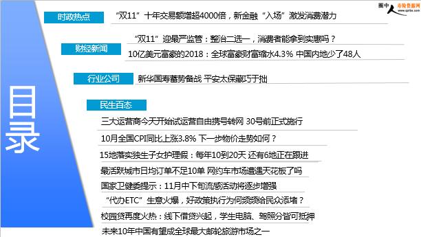 每日新闻速递 2019年11月11日 星期一 目录 时政热点 财经新闻 行业公司 民生百态 “双11”十年交易额增超4000倍,新金融“入场”激发消费潜力 “双11”迎最严监管:整治二选一,消费者能拿到实惠吗? 10亿美元富豪的2018:全球富豪财富缩水4.3% 中国内地少了48人 新华国寿蓄势备战 平安太保藏巧于拙 三大运营商今天开始试运营自由携号转网 30号前正式施行 10月全国CPI同比上涨3.8% 下一步物价走势如何? 15地落实独生子女护理假:每年10到20天 还有6地正在跟进 最活跃城市日均订单不足10单 网约车市场遭遇天花板了吗 国家卫健委提示:11月中下旬流感活动将逐步增强 “代办ETC”生意火爆,好政策执行为何频频给民众添堵? 校园贷再度火热:线下借贷兴起,学生电脑、驾照分皆可抵押 未来10年中国有望成全球最大邮轮旅游市场之一 时政热点 “双11”十年交易额增超4000倍,新金融“入场”激发消费潜力 2019-11-10 07:06 来源:中国网财经 从2009年至今,第十一个“双11”购物狂欢节即将到来,很多人早已摩拳擦掌预备狂买一番,也有很多人像王先生一样已经买了很多。从阿里官方发布的交易数据看,2009年第一个“双11”时,当天的交易额是5200万元,而去年的数据是2135亿元,10年时间增长了4100多倍。同期,京东商城“双11”期间交易额为1598亿元,同比增长25.7%。要注意的是,京东统计的周期是从2018年11月1日00:00至11月11日24:00。中国网络消费的增长速度由此也可见一斑。分析认为,一年一度的“双十一”,从某种意义上看,就是体现中国经济活力的晴雨表。敢于花钱,敢于“清空”长长的购物单,中国消费者用手“投票”表达了对未来经济发展的信心。 财经新闻 “双11”迎最严监管:整治二选一,消费者能拿到实惠吗? 2019-11-10 07:14 来源:中国新闻网 记者注意到,今年双十一的监管非常重视电商平台强迫商家“二选一”问题,原因主要是“二选一”问题今年凸显。近日,格兰仕对外发布情况通报称,于2019年10月28日向广州知识产权法院就天猫涉嫌滥用市场支配地位等相关事宜提起诉讼,并于11月4日得到受理。实际上,2019年1月1日起施行的《电子商务法》就对电商“二选一”做了规范。2019年“618”前夕,国家市场监管总局曾召开座谈会,要求电商平台禁止通过协议等方式限制、排斥促销经营者参加其他平台组织的促销活动。2019年6月至11月开展的2019网络市场监管专项行动(网剑行动),也严厉打击不正当竞争行为,依法查处电商平台强迫商家“二选一”行为。