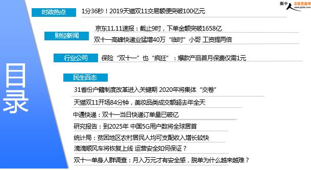 每日新闻速递 2019年11月12日 星期二 目录 时政热点 财经新闻 行业公司 民生百态 1分36秒!2019天猫双11交易额便突破100亿元 京东11.11速报:截止9时,下单金额突破1658亿 双十一高峰快递业猛增40万“临时”小哥 工资提两倍 保险“双十一”也“疯狂”:爆款产品首月保费仅需1元 31省份户籍制度改革进入关键期 2020年将集体“交卷” 天猫双11开场84分钟,美妆品类成交额超去年全天 中通快递:双十一当日快递订单量已破亿 研究报告:到2025年 中国5G用户数将全球居首 统计局:贫困地区农村居民人均可支配收入增长较快 滴滴顺风车将恢复上线 运营安全如何保证? 双十一单身人群调查:月入万元才有安全感,脱单为什么越来越难? 时政热点 1分36秒!2019天猫双11交易额便突破100亿元 2019-11-11 11:06 来源:经济观察报 伴随“猫晚”的进行,时至11月11日零点的到来,2019年的天猫双11全球购物狂欢节正式启幕。杭州阿里巴巴西溪园区的媒体中心,时隔五年后又重新成为了天猫双十一的主会场。经济观察网记者在现场看到,零点一过,成交额的数字便如火箭般迅速飙升。根据天猫双11媒体中心公布的数据显示,仅过1分36秒,2019天猫双11的成交额便突破了100亿元,相较去年直接缩短了29秒。2018年年天猫双11全球狂欢节全天交易额达到了2135亿,曾创下了历史新纪录。对于今年的成交额情况,媒体中心依然采取了实时播报的方式,记者在现场看到,12分49秒时成交额超过了500亿,而仅仅17分06秒后,成交额超过了571亿,值得注意的是,这个数字正是五年前的2014年天猫双11全天宗成交额。 财经新闻 京东11.11速报:截止9时,下单金额突破1658亿 2019-11-11 12:14 来源:封面新闻 2019年11月1日零时至11月11日上午9时,“11.11京东全球好物节”的累计下单金额突破1658亿元。家电类销售火爆。高端化趋势明显:1-10日高端手持吸尘器成交额同比增长150%,2000元以上高端美容器产品成交额同比增长超过170%。取暖电器的成交额达到去年同期的2.6倍,厨房电器整体累计成交额增长50%以上,电饭煲销售数量超过100万台,净水器成交额同比增长65%。按摩椅销成交同比翻倍。
