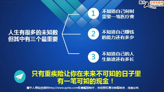 销售健康险必须牢记的四个神奇数字 根据卫生部统计:人一生当中罹患大病的几率高达72.18%,其他人因为来不及罹患大病就因意外或自杀先走了,所以人一定会得重大疾病! 2018年3月15日,两会在北京召开, 会议结束后政协委员呼吁我国民众在 经济条件允许的情况下,一定要补充 商业大病保险,保额30万元。 大病不是绝症!5年生存率是关键! 所谓5年生存率是指大病治愈后, 能够平安活过5年,基本就跟正常人一样的。在我国5年生存率是60%,欧美国家高达80-90%,所以说大病不是绝症。 罹患大病三个人中:有一个人治的好,有一个人治 不好,有一个人因为没钱不得不放弃治疗。 有一位妈妈为他的孩子投保了50万大病险,她是这样说的:“孩子罹患大病,能不能治是老天和 医生的事;有没有钱治是我的事。如果治不好,我会很难过,但我能放得下。但如果没有钱不得 不放弃治疗,我会很伤心,一辈子都不能原谅自己。很多人说孩子罹患大病是概率问题,但身为 他的妈妈,我不敢也不愿意赌。” 你愿意赌吗? 已有社保? 很健康;注重养生;也没有遗传病史没有钱? 善用密码 大病=绝症…医不了,不用医了。不需要… 善用神奇密码 很单纯,只做两件事: 注意力+兴趣 张先生,我今天专程来找你,只花你9分钟时间,而且我 跟你保证2件事:我绝不会让你花钱买你不需要的东西如果你觉得我说的没有用,可以随时结束我们的谈话 很单纯,只做两件事:一、注意力 张先生,请问您工作几年了?(**年)那您能存下收入的50%吗?(能或不能) 那您能承受收入50%损失吗?(能或不能)那我今天和您来分享如何用你收入的5%保护您95%的收入 我相信您一定有兴趣来了解一下。