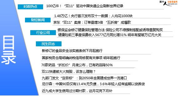 每日新闻速递 2019年11月14日 星期四 目录 时政热点 财经新闻 行业公司 民生百态 100亿件!“双11”驱动中国快递企业刷新世界纪录 1.48万亿!央行首次发布双十一数据:人均花1000块 京东“双11”卖房:订单量增3倍 “五折房”成爆款 银保监会修订健康保险管理办法 保险公司不得强制搭配或诱导重复购买 健康险前三季度保费收入5677亿元同比增31% 明年有望破万亿元大关 新修订的食品安全法实施条例下月起施行 国家税务总局明确纳税信用修复有关事项 明年起施行 70款药品“折扣价”月底公布,已有药品降50% 双11快递被大火烧毁,该怎么理赔? 九部门发文“定目标”:到2050年全面建成世界一流港口 尼尔森:中国90后仅有13.4%无负债,3.6%年轻人经常逾期以贷养贷 近九成大学生使用过分期付款,这月花完下月补 时政热点 100亿件!“双11”驱动中国快递企业刷新世界纪录 2019-11-13 07:13 来源:新华网 12日18时32分25秒,当上海市一名用户购买的一份四川省长宁县农特产长裙竹荪被当地网点揽收时,中通快递迎来了2019年的第100亿件快递,成为中国第一家达到百亿件量级的快递企业,再次刷新了世界纪录。12日晚间,在中通快递位于上海的“双11”指挥中心内,大屏幕上不断滚动的数字显示当天的订单量、揽收量和网络运行情况。“双11”当天,中通快递订单量超2亿件,揽收量超1亿件,为100亿件快递的到来做足了“热身”。中通快递年度业务量突破100亿件大关,是中国快递业高速发展的一个缩影。从2014年中国快递全行业业务量突破100亿件,到2019年单一企业业务量破100亿件、全行业预计突破600亿件,只花了5年的时间。 财经新闻 1.48万亿!央行首次发布双十一数据:人均花1000块 2019-11-13 11:12 来源:21世纪经济报道 也许你对这个数据没什么直观感受,但它相当于全国人民每人下单超过1笔,人均下单1000元!统计局公布的2018年国内生产总值GDP是90.03万亿元,也就是说,一个“双十一”相当于去年GDP的1.65%!11月12日晚间,中国人民银行微信公众号发布数据:“双十一”当天网联、银联共处理网络支付业务17.79亿笔、金额14820.70亿元,同比分别增长35.49%、162.60%。也许你对这个数据没什么直观感受,但它相当于全国人民每人下单超过1笔,人均下单1000元!统计局公布的2018年国内生产总值GDP是90.03万亿元,也就是说,一个“双十一”相当于去年GDP的1.65%!