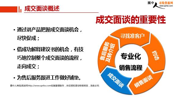 以需求为导向的成交面谈 目 录 CONTENTS 通过讲产品把握成交面谈机会,尽快促成;借成功解释建议书的机会,有技巧地控制整个成交面谈的流程,走向成交;为售后服务跟进工作做好铺垫。 成交面谈概述 成交面谈的重要性 名片公司简介彩页投保单(3张以上) 电脑或平板(已下载移动出单系统)建议书计算器、白纸签字笔(2-3支) 注:如用MIT展业,还需电脑、POS机、3G上网卡等 成交面谈概述 成交面谈的事前准备 步骤一:强化需求步骤二:五讲之讲产品(讲解建议书)步骤三:异议处理步骤四:要求转介绍 成交面谈四步曲 还记得在岗前培训中学习到的面谈步骤吗? 郝先生有一定的收入,最近喜得贵子,比较关注孩子的未来。想购买保险作为送给孩子的礼物。客户经理xx通过面谈,收集到了准客户郝先生的相关资料: 客户资料:丈夫:郝先生,男,30岁,企业单位中层干部,月收入8000元妻子:甄女士,女,28岁,医院护士,月收入4500元儿子:郝宝宝,男,刚出生,预计21岁大学毕业 案例分析 xx结合客户的资料,为准客户推荐XX产品: 组合简介:交 费:0岁男孩,年交保费 元, 年交 案例分析 根据分公司主销险种,设计产品方案 目 的:将话题引向建议书,强调建议书是应客户需求而设计的,能解决客户所担心的问题; 要 点:以客户需求为导向,补充客户保障缺口。核心内容—— 步骤一:强化需求 客户经理:经过上次见面,我了解了您的一些基本情况,您希望用最合理的缴费,为您宝贝儿子的未来做规划。根据您的需求,经过分析之后,我已经为您精心设计了一份名叫“XXXX”的少儿险建议书,以您目前的情况来看,这份建议书非常适合您。