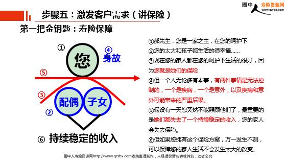 以需求为导向的销售面谈回顾及通关 销售面谈的步骤回顾 步骤一:寒暄赞美步骤二:道明来意、安排座位步骤三:介绍行业及公司背景(讲行业、讲公司、讲自己)步骤四:收集客户资料步骤五:激发客户需求(讲保险)步骤六:重申客户需求和预算步骤七:约定下次会面的时间 销售面谈的重中之重! 核心内容:郝先生,今天我有一个想法同您分享。这个是一般人的家庭收入分配图,大概40%-50%是用于衣食住行等基本生活支出,不知道郝先生每个月的基本生活费用是多少呢?…另外还会有10%左右是人情往来。然后还会有一点投资,比如股票、住房、珠宝等,不知道郝先生您现在的房子是租的还是买的?…不知道还有没有银行贷款呢?…除此之外,一般人一定会用收入的5%-15%来做一个家庭的保障方案。 目 的: 1、找寻客户的资产及负债状况 2、让客户明确一般家庭都有一小部分收入用于家庭保障方案 收入分配情况 步骤四:收集客户资料 收入分配图 ①郝先生,您是一家之主,在您的呵护下 ②您的太太和孩子都生活的很幸福…… ③现在您的家人都在您的呵护下生活的很好,因为您就是她们的保险 ④但一个人无论多有本事,有两件事情是无法控制的,一个是疾病,一个是意外,以及疾病和意外可能带来的严重后果。 ⑤假设有一天您突然不能照顾他们了,最重要的是她们都失去了一个持续稳定的收入,您的家人会失去保障。 ⑥但如果您拥有这个保险方案,万一发生不测,可以保障您的家人生活不会发生太大的改变。 您 配偶 子女 持续稳定的收入 步骤五:激发客户需求(讲保险) 第一把金钥匙:寿险保障
