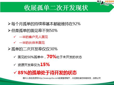 孤单经营与管理 思考 “收”的工作离司回访、续收、复效、变更、孤单分配等专人追踪、制式反馈、激活孤单、服务客户、经营关系请问哪些涉及到孤单?如何将表象的孤单管理落实到日常基础管理中?有没有单纯的孤单管理? 公司层面对孤单的认识 是归属公司的特殊资产是服务的接力棒/埋下的地雷是NBSS上方的“水龙头” 是公司品牌力和影响力的延续是老客户深耕的沃土是销售队伍中真正的“市场维护部” 伙伴层面看孤单 良性循环:很认可、有渴求、有开发的成就感、有依赖感;恶性循环:不会用、受打击、影响考核、不想要、有抵触。 理由一:有孤单——客户有保证 理由二:有津贴——收入有保障 理由三:晋升快——跑过同龄人 新人加盟收展的理由 思考: 他们的离开是因为什么? ——是因为孤单不会经营! 每个月孤单的持续率基本都能维持在92% 但是孤单的面见率不到50% 一半的客户无人面见一半的伙伴未面见孤单的二次开发率仅仅30% 面见的50%孤单中,70%处于未开发的状态资源开发率仅为15% 85%的孤单处于待开发的状态 收展孤单二次开发现状 客观——占比5% 客户去世、坐牢、跑路号码换了、地址搬了 主观——占比95% 交费困难的会去找,交费正常的不去;客户一直忙, 不愿意见面;之前附加险停办,主险被重新分配给其他人,没有再追踪;客户有人服务,不知如何应对;客户态度不好,不想联系 不去拜访的原因 孤单能做什么? 名正言顺的代表公司做好保全服务(收展员是公司移动的xx)获取新单开发并延伸客户圈发现准增员对象 为什么要做孤单管理 公司对老客户跟踪服务的要求市场对公司服务品质的要求伙伴对老客户资源开发的要求 不忽视任何一位客户用心经营每一位客户让孤单不再孤单 孤单经营要求 《保险代理人合同》