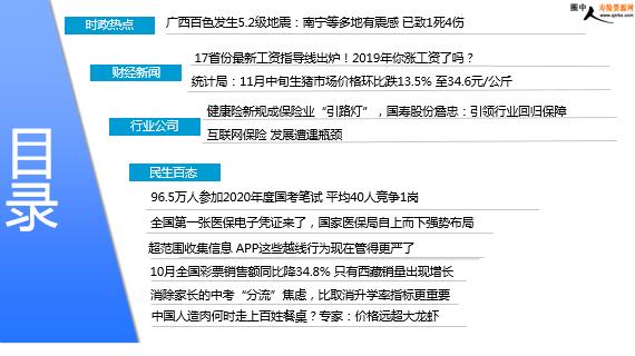 每日新闻速递 2019年11月26日 星期二 目录 时政热点 财经新闻 行业公司 民生百态 广西百色发生5.2级地震:南宁等多地有震感 已致1死4伤 17省份最新工资指导线出炉!2019年你涨工资了吗? 统计局:11月中旬生猪市场价格环比跌13.5% 至34.6元/公斤 健康险新规成保险业“引路灯”,国寿股份詹忠:引领行业回归保障 互联网保险 发展遭遇瓶颈 96.5万人参加2020年度国考笔试 平均40人竞争1岗 全国第一张医保电子凭证来了,国家医保局自上而下强势布局 超范围收集信息 APP这些越线行为现在管得更严了 10月全国彩票销售额同比降34.8% 只有西藏销量出现增长 消除家长的中考“分流”焦虑,比取消升学率指标更重要 中国人造肉何时走上百姓餐桌?专家:价格远超大龙虾 时政热点 广西百色发生5.2级地震:南宁等多地有震感 已致1死4伤 2019-11-25 10:43:33 来源:震长 据中国地震台网正式测定,11月25日9时18分在广西百色市靖西市发生5.2级地震,震源深度10千米,震中位于北纬22.89度,东经106.65度。南宁、百色等多地有震感。经初步核实,目前大新县已有1人死亡4人轻伤。震区建筑以砖混结构为主,部分房屋出现裂缝,部分道路中断,会有滚石发生。自治区地震局地震趋势会商会意见:近期内原震区发生更大地震的可能性不大,但不排除发生4级左右余震的可能。 财经新闻 17省份最新工资指导线出炉!2019年你涨工资了吗? 2019-11-25 07:28 来源:中新经纬 从各省份已公布的2019年企业工资指导线情况来看,截至目前,17个省份中,除了宁夏6.5%、吉林6.0%、上海5%-6%、新疆5%,其余13省份的基准线都在7%以上。北京、江西、山西和辽宁4省份基准线均站上8%,其中,北京以8%-8.5%的基准线居于首位。中新经纬客户端梳理17省份数据发现,除了贵州(2018年企业工资指导线不明确),今年多地企业工资指导线的基准线、上线和下线有所变动。基准线方面,与2018年相比较,今年辽宁、青海对基准线进行了上调,北京、山西、甘肃、天津、陕西、宁夏、上海、新疆等8省份对基准线进行了下调,其余省份则未做调整。