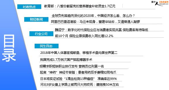 每日新闻速递 2019年11月27日 星期三 目录 时政热点 财经新闻 行业公司 民生百态 教育部:八省份截留克扣营养膳食补助资金1.7亿元 全球负利率趋向深化的2020年,中国经济怎么看、怎么办? 阿里巴巴重返港股:马云未现身,董建华站台,又请普通人敲锣 魏迎宁:数字化时代保险业应与消费者实现共赢 保险费率有待降低 前10个月 保险业原保费收入同比增12.2% 2018年中国人体器官捐献量、移植手术量均居世界第二 我国完成1.7万例次国产脑起搏器手术 招聘求职短缺职业排行发布 营销员位列第一名 起底“神药”神经节苷脂:患者用药后手萎缩如同鸡爪 日本将实证试验“1滴血检测13种癌症” 准确率达99% 河北9岁女童上学路上被两只大狗咬死:遭拖拽50米左右 时政热点 教育部:八省份截留克扣营养膳食补助资金1.7亿元 2019-11-26 04:29 来源:中国青年网 记者今天从教育部新闻通气会上获悉,教育部自今年6月初开展漠视侵害群众利益专项整治工作以来,截至目前共发现截留克扣营养膳食补助资金问题37起,涉及河北、河南、湖南、广西、云南、陕西、青海、新疆8省区,共计金额1.74亿元,目前均已整改到位。此外,教育部发现档案资料不全、招投标程序不规范等日常管理问题20起,投入保障不足、食堂闲置、人员配备不到位等地方责任不落实问题10起,将营养改善计划理解为“免费餐”等政策理解偏差问题6起,食品安全隐患1起,目前已督促各地严格落实相关政策措施,确保整改到位。 财经新闻 全球负利率趋向深化的2020年,中国经济怎么看、怎么办? 2019年11月26日 11:25 来源:经济观察报 “贸易保护主义和全球负利率是最大挑战。”财政部原副部长朱光耀在11月10日由工银国际与财新传媒联合举办的“2019国际投资论坛” 上表示,WTO最关键的上诉机制面临着停摆,WTO面临着失去运作功能的风险,全球主要工业化国家出现了负利率的趋势,这是没有遇到过的政策挑战。目前,欧央行已经是实行0.5%的负利率的政策,日本中央银行继续实行-0.1%的利率政策。从2019年10月15日开始,美国联邦储备银行转变了此前采取的削减美联邦储备银行资产负债表的行动方向,从削减转变为增加,每月购买600亿美金的政府债券,实现到2020年的第二季度,但是至少要到二季度,时间长度至少9个月,每个月600亿,9个月5400亿美金,这样如果实施完毕,它的资产负债表的规模就要回到4.5万亿,甚至更高。