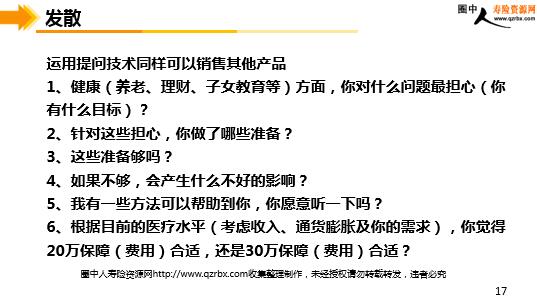 健康险销售六问 2019年1-8月份,健康险的销售,势如破竹 过往的销售方式——“讲” 弊 利 给客户提供大量信息很自信,觉得自己很“专业” 客户被说服后,很有“成就感” 讲的时候,客户的感受是什么?是否听懂?我都不知道很容易产生拒绝问题,我又要讲很多来处理。很被动客户只是被我“说服”,并没有发自内心“想要” 所以做大单不容易。 反思 一位客户抱怨说:“你们保险业务员太能讲了。告诉你,在你之前,来跟我讲保险的业务员不下十几个,说些什么东西又听不懂,一会儿讲这个好,一会儿讲那个好,简直烦死了! 保险是好东西,为什么客户不容易接受?什么样的销售方式双方都很轻松,客户容易接受呢? 反思 保险不只要会“讲” 更会要“问”!客户的思考与回答,是迈向成交的阶梯! 健康险六问 一问:健康方面,你对什么问题最担心?目的:了解需求,引发思考。要点:倾听并积极回应,同时做好记录。回应的方法:“嗯……”“哦……”“然后呢?”“接着怎么样?”、“您是说(复述问题)”、“我也有同感(简单回答)”。 健康险六问 二问:针对这些担心,你做了哪些准备?目的:为计算保障缺口做好铺垫。通常的答案:只有医保;有健康险,一般保障都不足。 健康险六问 三问:这些准备够吗?目的:让客户直观了解保障不足。要点:拿出纸和笔,边写边讲。说明内容:说明医保报销额度,尤其突出重疾方面;说明目前大病治疗的费用通常是多少。 健康险六问 四问:如果不够,会产生什么不好的影响?目的:放大影响,扩大需求。为切入寿险话题做铺垫。要点:“不好的”信息尽量让客户先讲,我在肯定之后,用案例继续补充。