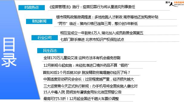每日新闻速递 2019年12月2日 星期一 目录 时政热点 财经新闻 行业公司 民生百态 《疫苗管理法》施行:疫苗犯罪行为将从重追究刑事责任 楼市限购政策微调提速:多地抢跑人才新政 南京等地还发购房补贴 “两节”临近:猪肉价格已连降三周,葱价创5年新低 相互宝成立一年救助1万人 湖北加入成员数居全国第五 七部门联手推进 北京市知识产权保险试点 全球170万儿童染艾滋 这种方法本有机会避免悲剧 12月新规今起实施:未经批准进口境外药品不算“假药” 首批90后1个月后就30岁 脱发精致穷离婚潮你经历了吗? 中国适度劳动研究会会长:过劳程度越严重,经济损失越大 三大运营商今天正式执行新规:办手机号将全面实施人像比对 15人中毒入院 昆明发布谨慎食用东北油豆预警公告 最高可打5.5折!12月起全国近千趟火车票价调整 时政热点 《疫苗管理法》施行:疫苗犯罪行为将从重追究刑事责任 2019年12月1日11:35 来源:央视网新闻 《疫苗管理法》是我国对疫苗管理进行的专门立法,将对疫苗实行最严格的管理制度,其中明确,疫苗犯罪行为依法将从重追究刑事责任。此外,《疫苗管理法》还为疫苗管理的全链条、各环节、各主体都设定了严格的责任。有些是制度上的创新,比如国家将实行疫苗全程电子追溯制度、预防接种异常反应补偿制度和疫苗责任强制保险制度等。而有些是对原有措施的“升级”。在生产环节,疫苗管理法提出,国家对疫苗生产实行严格准入制度。从事疫苗生产活动,要在药品管理法规定的从事药品生产条件之外,满足更加严格的条件。 财经新闻 楼市限购政策微调提速:多地抢跑人才新政 南京等地还发购房补贴 2019年12月1日11:35 来源:第一财经 据中原地产统计,11月再次出现人才政策井喷的现象,全国累计有超过20城在11月发布了各种类型的人才吸引政策,其中包括南京、成都、中山等接近10个城市发布的人才政策中,都有于人才购房资格、购房补贴相关的内容。连续三天,广东第三大经济大市——佛山因房地产调控政策动向为业界所关注。在佛山之前,也早有多个城市调整人才政策,进而触及当地房地产调控政策。“当前针对人才的定向放松限购做法会成为一个趋势,”易居研究院智库中心研究总监严跃进表示,未来一些城市对于人才的购房限购政策微调的内容会增加,从而进一步促进相关就业者的购房和就业,总体上也会对此类区域的购房市场的活跃带来新的机会。