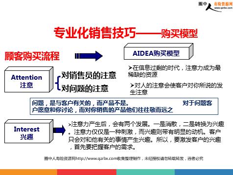 专业化销售技巧 课程大纲 专业化销售流程 专业化销售技巧 适应未来寿险市场竞争 提高队伍的整体综合素质 专业化推销流程介绍 促 成 异议处理 专业化销售技巧——购买模型 Attention 注意 AIDEA购买模型 问题,是与客户有关的,而产品不是。 对于问题客户愿意和你讨论,而对你销售的产品他们往往敬而远之 顾客购买流程 对销售员的注意对问题的注意 Interest 兴趣 专业化销售技巧——购买过程 客户开拓及接触(开场白) 需求分析 (需求探询与机会发现) 观念沟通及产品陈述 (传递核心信息) 处理异议 促成及售后服务 注意 建立兴趣 购买欲望 获得确认 购买 销售过程 购买过程 关键点 如何获得客户的注意 提问的技巧 双向沟通 平常心态 随时促成 销售的两大原则 愉快的感觉 问题的解决 解决客户的异议,可以为客户 完成心愿,消除担忧! 销售技巧之------约访