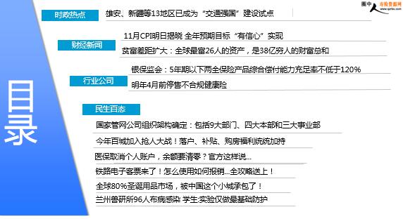 每日新闻速递 2019年12月10日 星期二 目录 时政热点 财经新闻 行业公司 民生百态 雄安、新疆等13地区已成为“交通强国”建设试点 11月CPI明日揭晓 全年预期目标“有信心”实现 贫富差距扩大:全球最富26人的资产,是38亿穷人的财富总和 银保监会:5年期以下两全保险产品综合偿付能力充足率不低于120% 明年4月前停售不合规健康险 国家管网公司组织架构确定:包括9大部门、四大本部和三大事业部 今年百城加入抢人大战!落户、补贴、购房福利统统加持 医保取消个人账户,余额要清零?官方这样说... 铁路电子客票来了!怎么使用如何报销...全攻略送上! 全球80%圣诞用品市场,被中国这个小城承包了! 兰州兽研所96人布病感染 学生:实验仅做最基础防护 时政热点 雄安、新疆等13地区已成为“交通强国”建设试点 2019-12-09 11:08 来源:新京报 交通运输部召开新闻发布会。据介绍,河北雄安新区、浙江省、重庆市、新疆维吾尔自治区等13个地区已成为第一批交通强国建设试点地区。目前,交通运输部正在开展第二批交通强国建设试点申报工作,启动了“十四五”综合交通运输发展规划编制。交通运输部新闻发言人、法制司司长魏东介绍,《交通强国建设纲要》(下称《建设纲要》)经党中央、国务院批准印发以后,交通运输部高度重视、积极部署,加快推进交通强国建设。魏东介绍,《建设纲要》印发以后,交通运输部制定了学习领会宣传贯彻重在落实《建设纲要》工作方案,召开交通强国建设试点工作启动视频会议,动员部署全行业加快推进交通强国建设。除了全面组织学习领会、广泛开展宣传贯彻外,交通运输部还印发了《任务分工方案》等配套方案。 财经新闻 11月CPI明日揭晓 全年预期目标“有信心”实现 2019-12-09 13:32 来源:第一财经 国家统计局将发布11月份全国居民消费价格指数(CPI)和工业生产者出厂价格指数(PPI)数据。值得注意的是,进入11月以来,猪价增速呈现下行趋势,猪肉涨价预期在降温。据农业农村部对200个批发市场监测调度,全国猪肉价格连续4周回落,降幅超过20%。2019年12月第一财经首席经济学家调研结果显示,参与调研的22位经济学家均认为11月CPI同比数值将高于上月,预测均值为4.19%,较统计局公布的10月值(3.8%)上升。其中,瑞银集团汪涛给出了最大的预测值4.7%,而最小值3.7%来自如是金融研究院管清友和毕马威康勇。