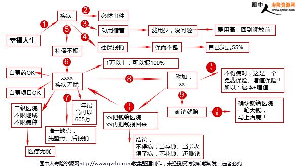 幸福人生 疾病 必然事件 动用储蓄 费用少,没问题 社保报销 保而不包 社保不报 xxxx 疾病无忧 1万以上,可以报100% 自费药OK 自费项目OK 二级医院不限地域不限病种 医疗无忧 唯一缺点:先垫付、后报销 附加: xx 不得病时,这是一个免费保险、增值保险!所以:返本+增值 确诊就赔 确诊就给医院一笔大钱,马上治病! xx把钱给医院 xx再把钱报回来