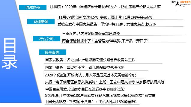 每日新闻速递 2019年12月11日 星期三 目录 时政热点 财经新闻 行业公司 民生百态 社科院:2020年中国经济预计增长6%左右,防止房地产价格大起大落 11月CPI再创新高达4.5% 专家:预计明年1月CPI将会破6% 爱彼迎发布中国房东报告:平均年龄33岁,女性房东占比62% 三季度内地访港客保单保费增速减慢 两全保险新规来了!监管层为5年期以下产品“开口子” 国家发改委:各地加快推进取消高速公路省界收费站工作 国家卫健委:建议中小学、幼儿园配置空气净化器 2020个税抵扣开始确认,月入不足万元基本无需缴纳个税 央行“电子信用证信息交换系统”上线:工农中建交邮等14家银行拔得头筹 中国自主研发艾滋病疫苗正在进行多中心临床试验 家庭标配!中国每100户家庭有33辆汽车城镇居民每10家就有4家有车 中国支线航空“失落的十八年”:飞机占比从16%降至5% 时政热点 社科院:2020年中国经济预计增长6%左右,防止房地产价格大起大落 2019-12-10 07:48 来源:21世纪经济报道 “2020年需要全面做好‘六稳’工作,使用好逆周期调节工具。只要保持就业稳定、居民收入增加、经济发展质量逐步提高,至于2020年经济增速在6%左右,是略高还是略低,都是可以接受的,都可以确保全面建成小康社会和‘十三五’规划圆满收官。”社科院工业经济研究所副所长李雪松表示。12月9日,中国社科院2020年《经济蓝皮书》发布会暨中国经济形势报告会在京举行,李雪松代表社科院中国宏观经济研究中心课题组介绍了主报告内容。临近年末,当部分机构在争议2020年中国经济是否要“保6”这个问题时,社科院课题组给出了他们的答案。 财经新闻 11月CPI再创新高达4.5% 专家:预计明年1月CPI将会破6% 2019-12-10 13:32 来源:经济观察报 国家统计局公布11月份全国居民消费价格(CPI)数据,数据显示,11月份同比上涨4.5%,创下近8年新高。从2019年2月开始,CPI同比涨幅呈不断上升的趋势,9月份CPI已同比上涨3%。在具体商品价格变动上,数据显示,食品中,11月份畜肉类价格上涨74.5%,影响CPI上涨约3.27个百分点,其中猪肉价格上涨110.2%,影响CPI上涨约2.64个百分点;蛋类价格上涨10.1%,影响CPI上涨约0.06个百分点;鲜菜价格上涨3.9%,影响CPI上涨约0.09个百分点;鲜果价格下降6.8%,影响CPI下降约0.12个百分点。