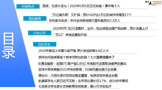 每日新闻速递 2019年12月13日 星期五 目录 时政热点 财经新闻 行业公司 民生百态 医保、社保大变化!2020年1月1日正式实施!事关每个人 “万亿俱乐部”又扩容:预计GDP达1万亿的城市将增至17个 负利率冲击波:年内全球各地银行宣布裁员约7.3万人 2020年开门红行至酣时,业内:险企转型加强产品创新,预计体量上行 “双12”来临运费险升级 2020年春运火车票今起开售 预计发送旅客4.4亿人次 明年如何继续享受个税专项附加扣除?七大重要提醒来了 交通运输部:全国ETC客户超1.85亿 年底前可全面取消省界收费站 全球半导体销售2021年将创新高,5G换机潮加速行业发展 国台办:大陆社保对在陆台胞全覆盖,包括在陆未就业台胞 赴美留学生人数已近天花板:去年同比增长仅1.7%,创10余年最低 七成受访学生家长支持教育惩戒制度,最认可点名批评 时政热点 医保、社保大变化!2020年1月1日正式实施!事关每个人 2019-12-12 07:38 来源:深圳本地宝 退休人员领取养老金的方式会发生变化,之前一般是通过银行卡或者是养老金存折领取,以后要通过社保卡领取了。按照今年10月份下发的《人社部办公厅关于压缩制发周期优化社会保障卡管理服务的通知》要求——2019年底,全面实现通过社保卡发放养老保险待遇。对此前通过其他途径发放的,本着便民利民原则,2019年底逐步转为社保卡发放。也就是说,以后退休人员领取养老金要换为社保卡了。目前,很多地方开始落实。需要注意的是,使用社保卡领取养老金,前提是要激活社保卡的金融功能,需要你拿着有效身份证和社保卡去社保卡发卡银行的网点进行激活,激活之后才能正常领取养老金。 财经新闻 “万亿俱乐部”又扩容:预计GDP达1万亿的城市将增至17个 2019-12-12 11:41:13 来源:海外网 万亿俱乐部”,指的是中国大陆全年GDP达到或超过1万亿元的城市。截至去年底,中国已有北京、上海、广州、深圳、天津、苏州、重庆、武汉等16座城市入围。到今年三季度末,全国已有12个城市稳稳地在“万亿俱乐部”拥有一席之地,预计到年底将增加至17个甚至更多。武汉东湖畔,一条绿道串联起磨山、听涛、落雁三大景区,绿意盎然;绿道另一端,是新兴企业鳞次栉比的东湖高新区,新意十足。这样宜居又宜业的武汉,正是中国“万亿俱乐部”的一名会员。今年前三季度,武汉以11528.4亿元的GDP总量提前跻身2019年“万亿俱乐部”名单。