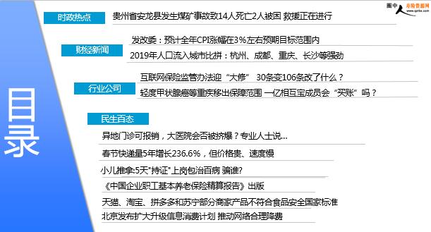 每日新闻速递 2019年12月18日 星期三 目录 时政热点 财经新闻 行业公司 民生百态 贵州省安龙县发生煤矿事故致14人死亡2人被困 救援正在进行 发改委:预计全年CPI涨幅在3%左右预期目标范围内 2019年人口流入城市比拼:杭州、成都、重庆、长沙等强劲 互联网保险监管办法迎“大修” 30条变106条改了什么? 轻度甲状腺癌等重疾移出保障范围 一亿相互宝成员会“买账”吗? 异地门诊可报销,大医院会否被挤爆?专业人士说… 春节快递量5年增长236.6%,但价格贵、速度慢 小儿推拿:5天"持证"上岗包治百病 骗谁? 《中国企业职工基本养老保险精算报告》出版 天猫、淘宝、拼多多和苏宁部分商家产品不符合食品安全国家标准 北京发布扩大升级信息消费计划 推动网络合理降费 时政热点 贵州省安龙县发生煤矿事故致14人死亡2人被困 救援正在进行 2019-12-17 09:55 来源:新华社 记者从贵州省黔西南布依族苗族自治州委宣传部获悉证实,17日1时30分许,安龙县广隆煤矿发生一起煤与瓦斯突出事故。经初步核实,当班井下作业人员23人,7人安全升井。截至9时,经全力搜救,14人死亡,2人被困。事故发生后,省州县三级党委、政府有关负责人即赶赴现场启动应急方案,组织应急、能源、公安、消防、安监、卫健等相关部门开展抢险救援和事故调查工作。 财经新闻 发改委:预计全年CPI涨幅在3%左右预期目标范围内 2019年12月17日00:28 来源:中新经纬 发改委17日就宏观经济运行情况举行发布会,发改委新闻发言人孟玮表示,总体上看,我国物价保持平稳运行具备坚实基础,工农业产品供应充裕,生猪生产正在逐步恢复,预计全年CPI涨幅在3%左右的预期目标范围内。