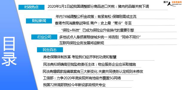 每日新闻速递 2019年12月24日 星期二 目录 时政热点 财经新闻 行业公司 民生百态 2020年1月1日起我国调整部分商品进口关税:猪肉药品等关税下调 年内74城调整公积金政策:有紧有松 保障刚需成主流 香港市民消费意欲降低 商户:史上最“寒冷”冬至 “保险+科技”已成为保险业升级换代的重要引擎 多地试点人身损害赔偿城乡统一 将告别“同命不同价” 互联网保险业务发展将迎新规 养老保障体制改革 考验我们经济学的功底和智慧 民法典拟明确高空抛坠物责任主体:物业服务企业应采取措施 民法典婚姻家庭编草案有三大新变化 夫妻共同债务认定规则未修改 工信部:力争2020年底实现所有地级市覆盖5G网络 我国72所高职院校今年新设家政相关专业 时政热点 2020年1月1日起我国调整部分商品进口关税:猪肉药品等关税下调 2019年12月23日08:29 来源:新华视点 为积极扩大进口,激发进口潜力,优化进口结构,自2020年1月1日起,我国将对850余项商品实施低于最惠国税率的进口暂定税率。其中,为更好满足人民生活需要,适度增加国内相对紧缺或具有国外特色的日用消费品进口,新增或降低冻猪肉、冷冻鳄梨、非冷冻橙汁等商品进口暂定税率;为降低用药成本,促进新药生产,对用于治疗哮喘的生物碱类药品和生产新型糖尿病治疗药品的原料实施零关税;为扩大先进技术、设备和零部件进口,支持高新技术产业发展,新增或降低半导体检测分选编带机、高压涡轮间隙控制阀门、自动变速箱用液力变矩器和铝阀芯、铌铁、多元件集成电路存储器、大轴胶片原料、光刻胶用分散液、培养基等商品进口暂定税率;为鼓励国内有需求的资源性产品进口,新增或降低部分木材和纸制品进口暂定税率。 财经新闻 年内74城调整公积金政策:有紧有松 保障刚需成主流 2019-12-23 07:39 来源:中新经纬 公积金向来与人们日常生活息息相关,据中新经纬客户端不完全统计,在2019年至少已有74城在公积金政策上进行调整。中新经纬客户端注意到,2019年以来,多城通过下调公积金贷款额度、限制“商转公”贷款等方式进行政策收紧。其中,西安市住房公积金管理中心在今年4月23日表示,5月13日起,该中心将实施资金流动性风险防控一级响应措施。下调住房公积金贷款总额度,计算倍数由18倍降至15倍;暂停西安地区(含西咸新区)以外购房提取公积金。