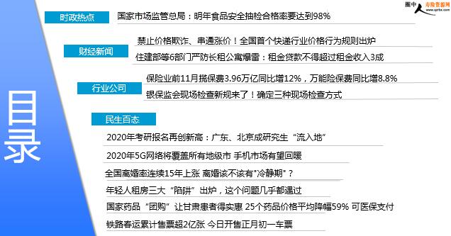每日新闻速递 2019年12月28日 星期六 目录 时政热点 财经新闻 行业公司 民生百态 国家市场监管总局:明年食品安全抽检合格率要达到98% 禁止价格欺诈、串通涨价!全国首个快递行业价格行为规则出炉 住建部等6部门严防长租公寓爆雷:租金贷款不得超过租金收入3成 保险业前11月揽保费3.96万亿同比增12%,万能险保费同比增8.8% 银保监会现场检查新规来了!确定三种现场检查方式 2020年考研报名再创新高:广东、北京成研究生“流入地” 2020年5G网络将覆盖所有地级市 手机市场有望回暖 全国离婚率连续15年上涨 离婚该不该有"冷静期"? 年轻人租房三大“陷阱”出炉,这个问题几乎都遇过 国家药品“团购”让甘肃患者得实惠 25个药品价格平均降幅59% 可医保支付 铁路春运累计售票超2亿张 今日开售正月初一车票 时政热点 国家市场监管总局:明年食品安全抽检合格率要达到98% 2019年12月27日05:34 来源:新京报 “明年食品安全抽检合格率达到98%、食品安全抽样检验量实现每千人4批次”,全国市场监管工作会议26日在京开幕,国家市场监管总局提出明年市场监管工作新目标。会议提出,明年市场监管部门将聚焦米面油、肉蛋奶、果菜茶等大宗食品,持续开展乳制品、肉制品以及餐饮质量安全提升行动,实施农药兽药使用减量和产地环境净化行动,盯住农药兽药残留超标和重金属污染等问题。在校园食品安全方面,要减少校园群体性食源性疾病事件。压实校长第一责任人责任,鼓励家长参与监督,大幅度提高“互联网+明厨亮灶”覆盖率,确保幼儿园、小学实现全覆盖。大力推动企业向社会、消费者公开承诺,坚持自查报告、“黑名单”制度,婴幼儿食品、大型肉制品企业自查报告率实现100%。 财经新闻 禁止价格欺诈、串通涨价!全国首个快递行业价格行为规则出炉 2019-12-27 12:22 来源:每日经济新闻 12月26日,北京市市场监管局发布了《北京市快递业价格行为规则》,围绕保障消费者知情权,列出了12条“不准”的情形,禁止价格欺诈、价格垄断、串通涨价等行为。其中部分条款是特别针对近年来引起广泛关注的虚假优惠等行为而提出。这也是全国首个针对快递行业的价格行为规则。