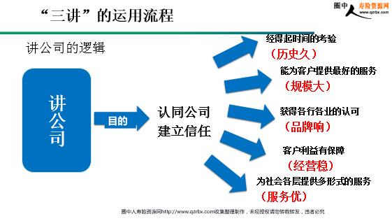 销售面谈-三讲 课程设置 课程目标 通过课程学习,认识“三讲” 在销售流程中的重要性,并掌握“三讲” 的内容。 销售流程再回顾 与客户面对面交流,通过观念引导,取得客户认同,并激发客户的购买需求 销售面谈包含2个环节:接洽三讲 目录 “三讲”的重要意义 “三讲”的运用流程 “三讲”的课堂演练 问题1:如果买一盒牙签,会重点考虑什么? 问题2:如果花一万元买一个包包,会重点考虑什么? “三讲”的重要意义 ——功能 ——品牌 案例(1/2) 某公司客户经理甲和张先生是同学,多次谈过保险,但张先生一直没有购买。某天,甲找到张先生,对他说:“今天是公司考核最后一天,如果这个月我还没开单就会被开除了。老同学帮帮忙,买份保险吧。” 碍于情面,张先生勉强买了一份保险,年交保费500元。 “三讲”的重要意义 案例(2/2) 一个月后,xx客户经理乙通过朋友介绍拜访了张先生。乙跟张先生谈了自己大学毕业后为什么选择寿险营销工作,以及为什么选择xx。张先生被乙的专业和理想所打动,对保险和xx有了新的认识。一周后,张先生给自己购买了一份保险,年交保费10万元。 “三讲”的重要意义 同一个客户面对不同的营销员做出的购买决定相差几十倍甚至上百倍! “三讲”的重要意义 “三讲”的重要意义 打通观念 建立信任 产生认同 让客户认同保险,激发客户的保险需求,为促成做铺垫保险销售中的所有困难和问题都可以用“三讲”来解决